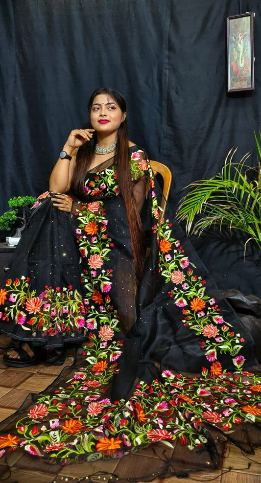 Black Pure Reshom Silk Mark Certified Muslin Embroidered Saree