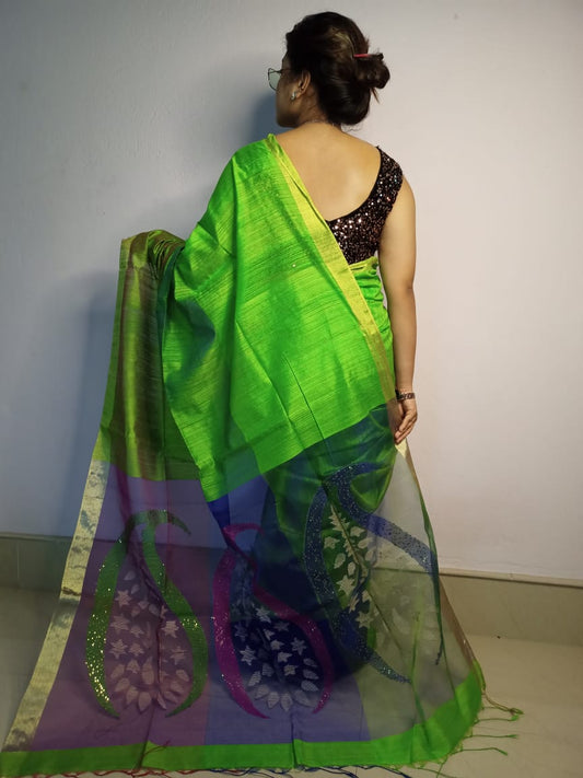 Tri-color Lime Green Handloom Matka Silk Mark Certified Muslin Silk Sarees