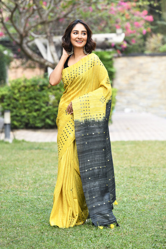 Black and Yellow Mirror Work Pure Silk Mark Certified Tussar Ghicha Silk Sarees