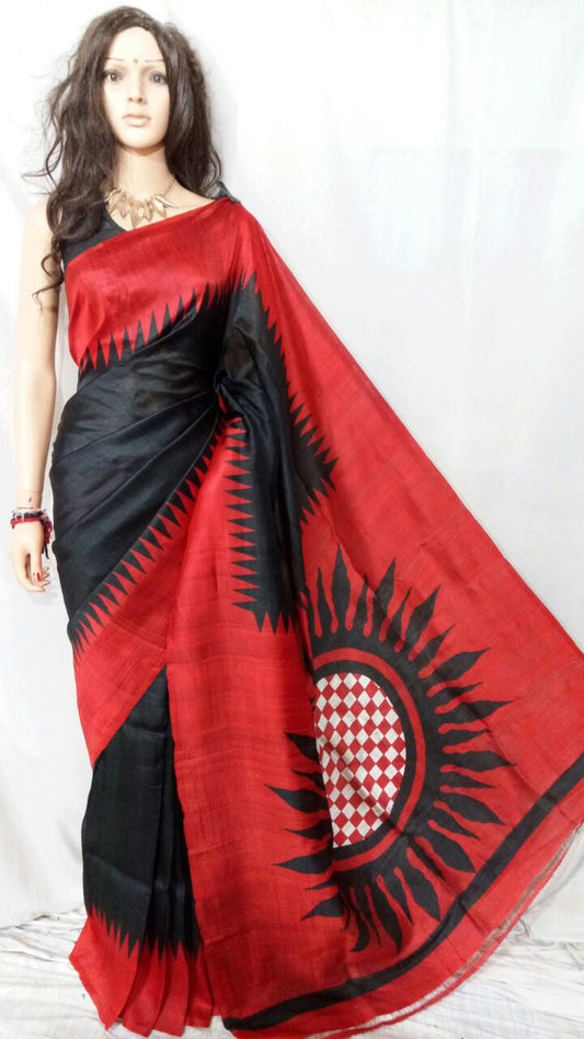 Red Black Pure Wax Hand Painted Silk Mark Certified Murshidabad Silk Sarees