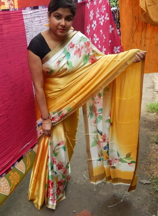 Yellow Grey Wax Batik Hand Painted Silk Mark Certified Murshidabad Silk Sarees