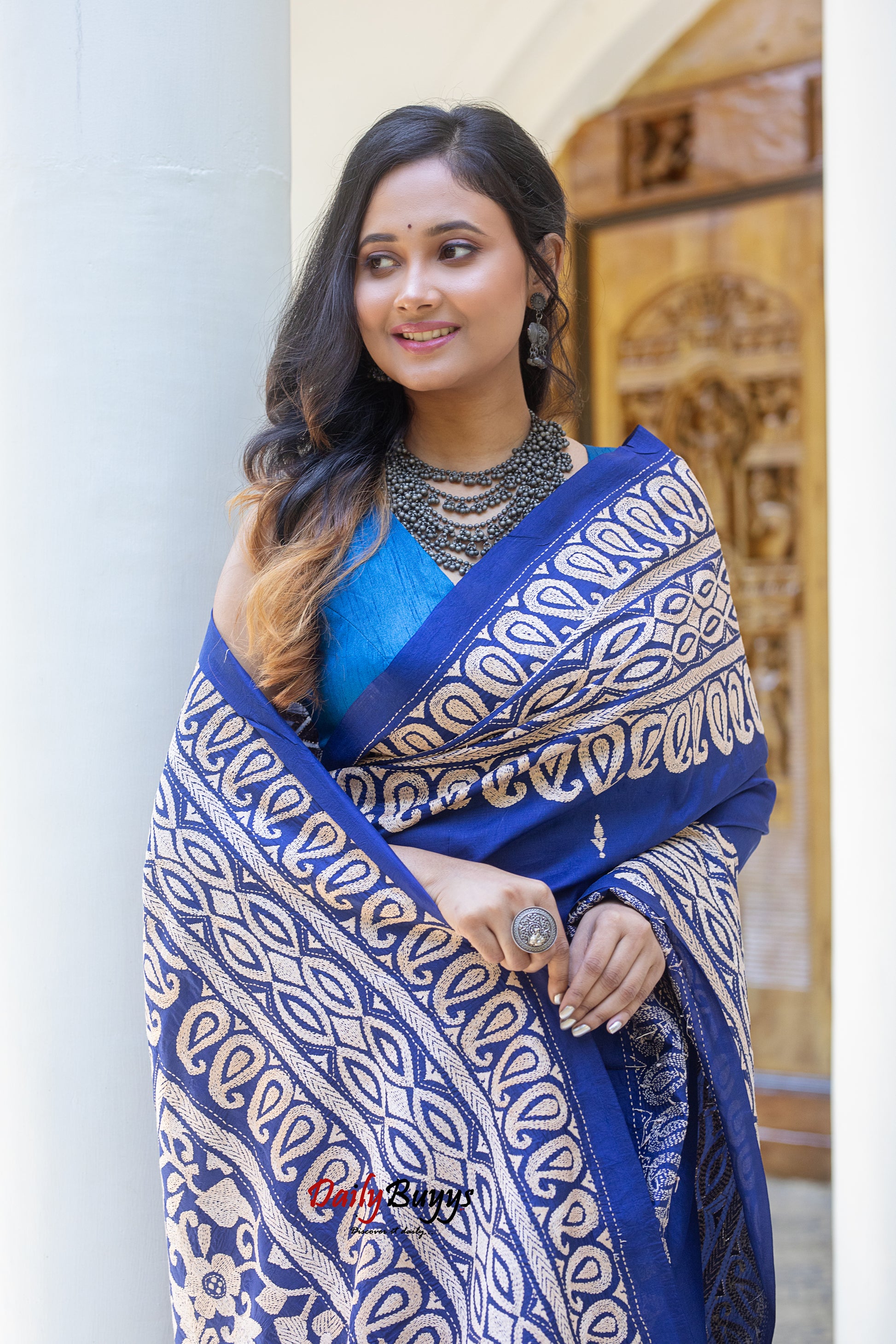 Blue Hand Embroidery Kantha Stitch Saree on Pure Silk Sarees with Silk Mark Certified & Blouse Piece.