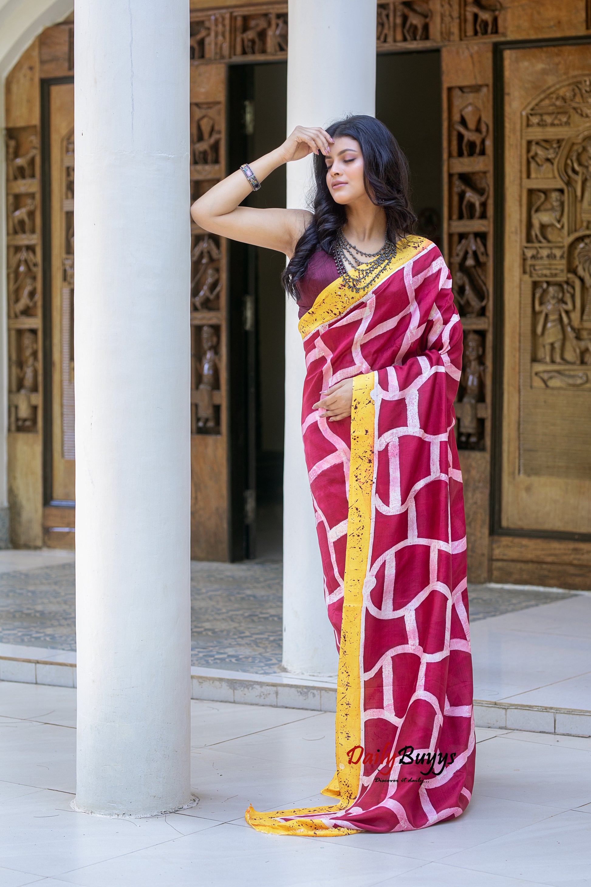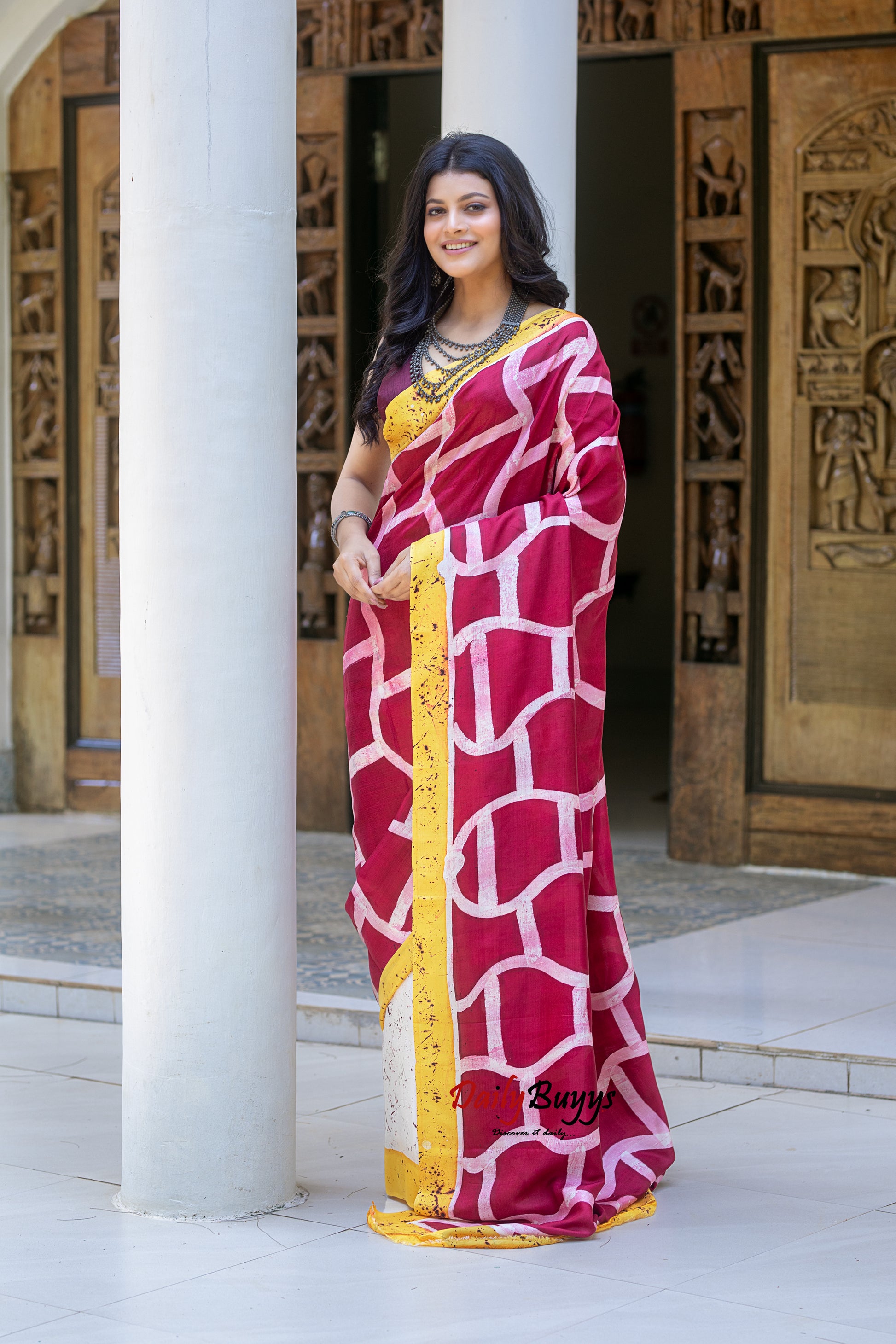 Red Wax Batik Block Printed Painted Silk Mark Certified Bishnupuri Silk Sarees