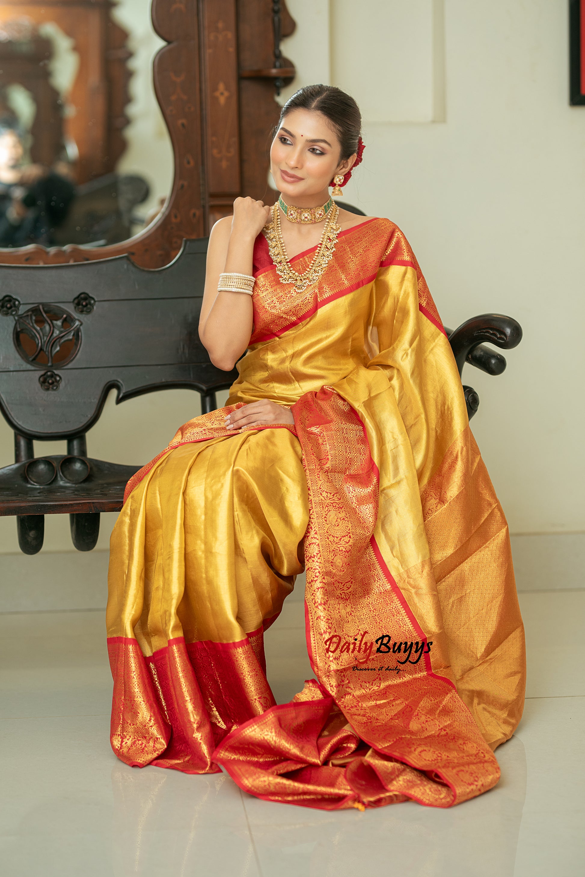 Yellow Red Tissue Kanjivaram Banarasi Silk Sarees