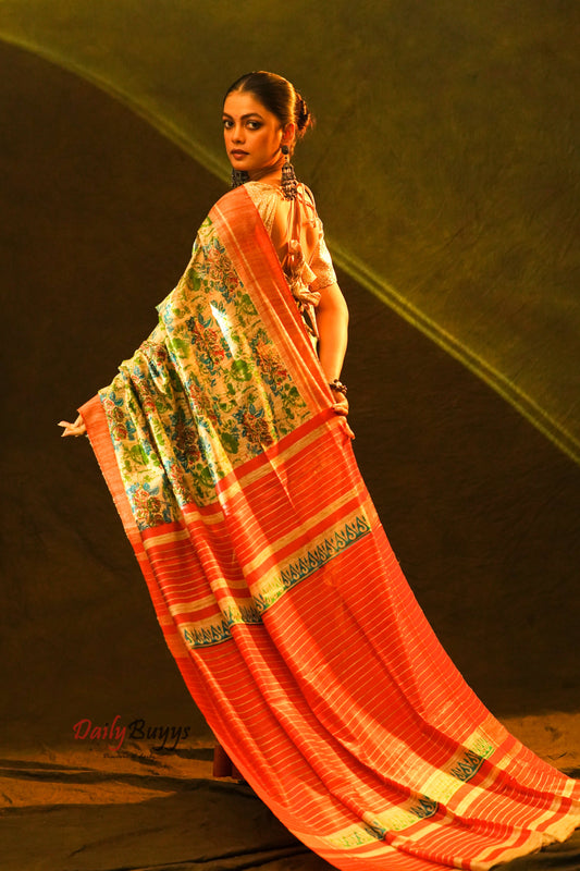 Peach Floral Hand Painted Pure Silk Mark Certified Kalamkari Tussar Silk Sarees