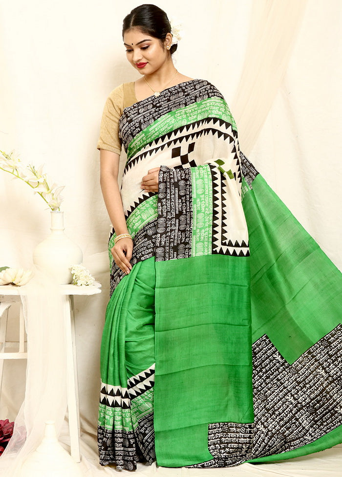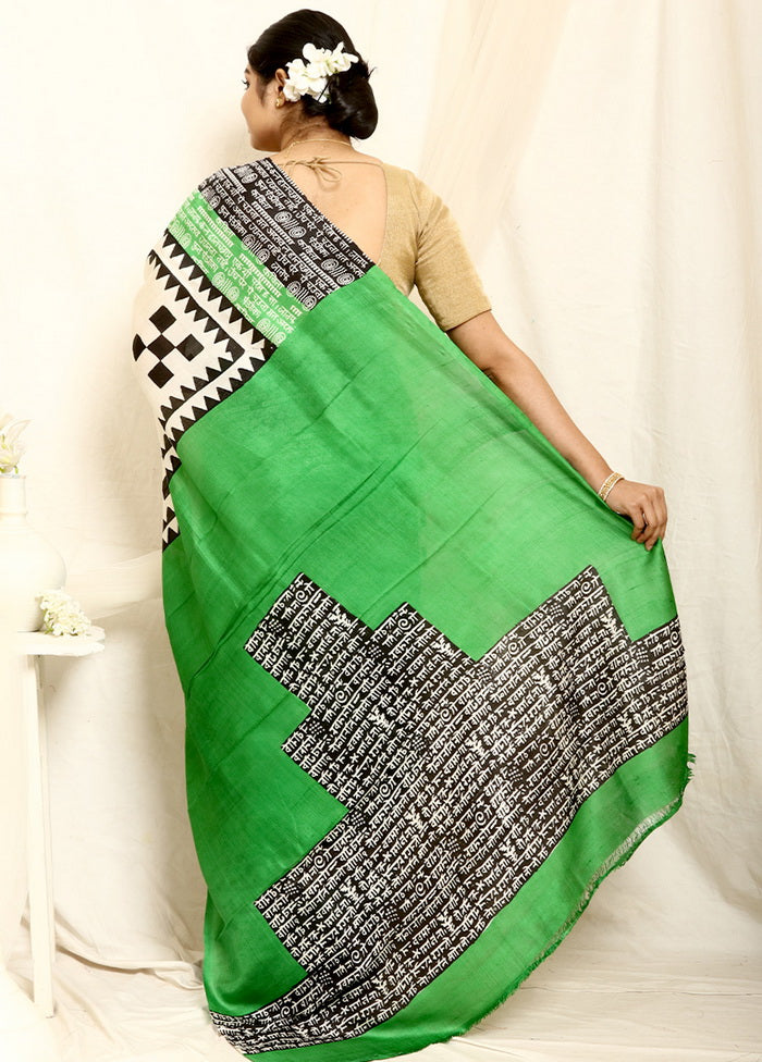 Green Block Printed Pure Silk Mark Certified Bishnupuri Silk Sarees
