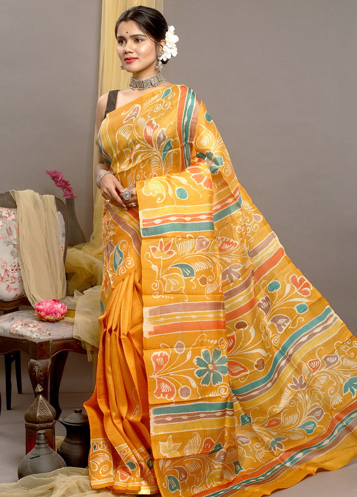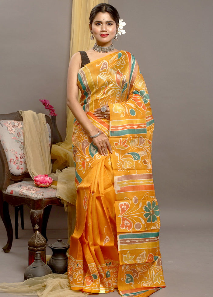 Hand Painted Yellow Color Pure Silk Mark Certified Bishnupuri Silk Sarees