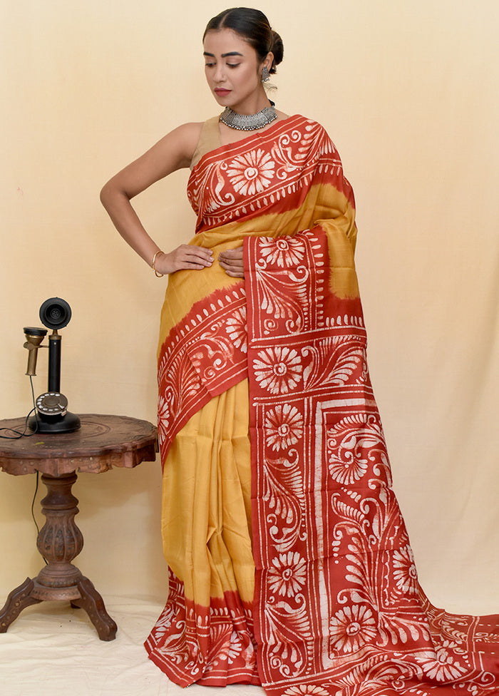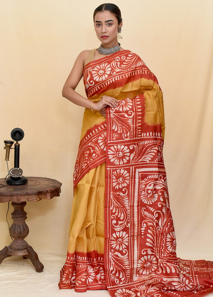 Red & Yellow Hand Painted Pure Silk Mark Certified Bishnupuri Silk Sarees