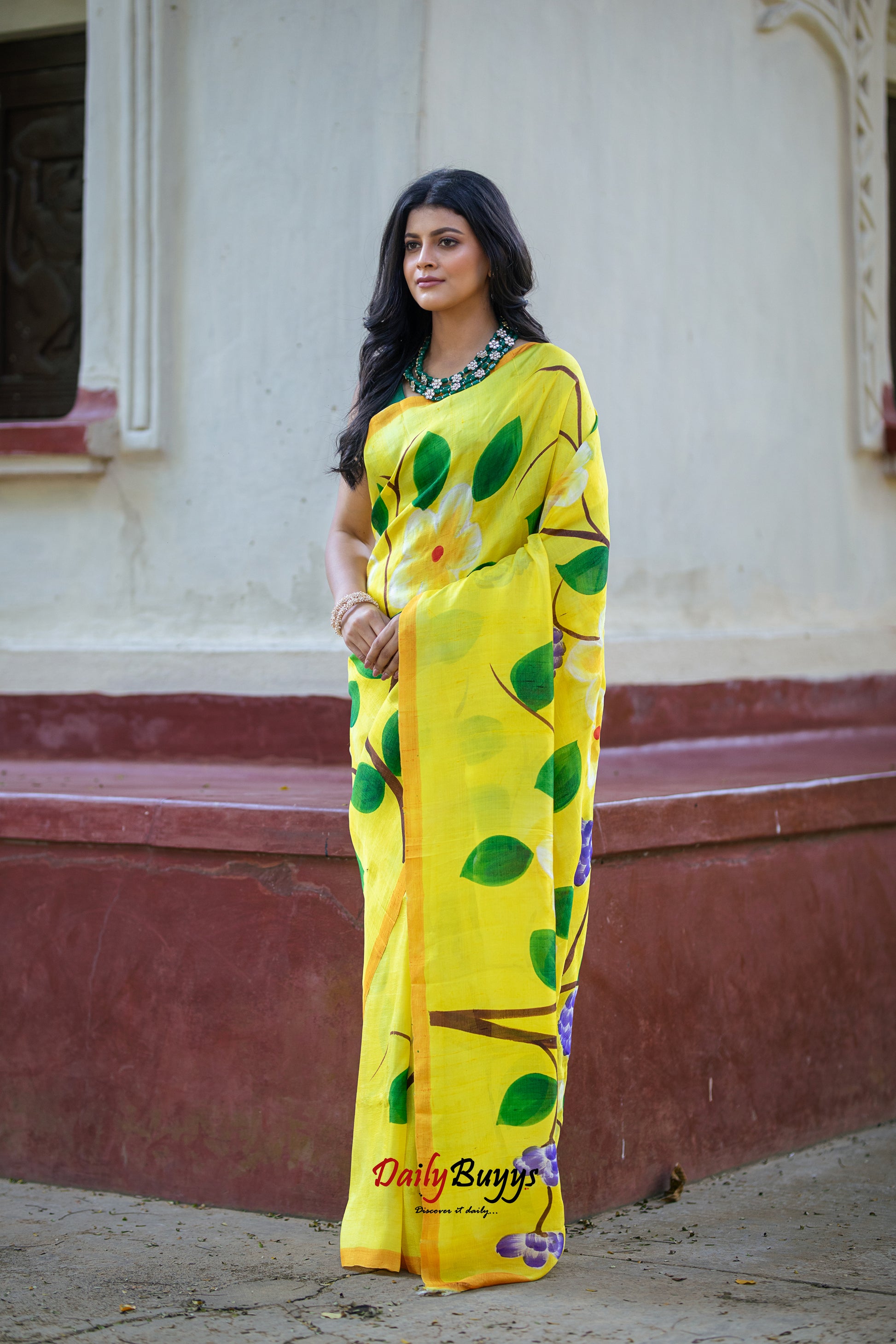 Yellow Floral Hand Painted Silk Mark Certified Bishnupuri Silk Sarees