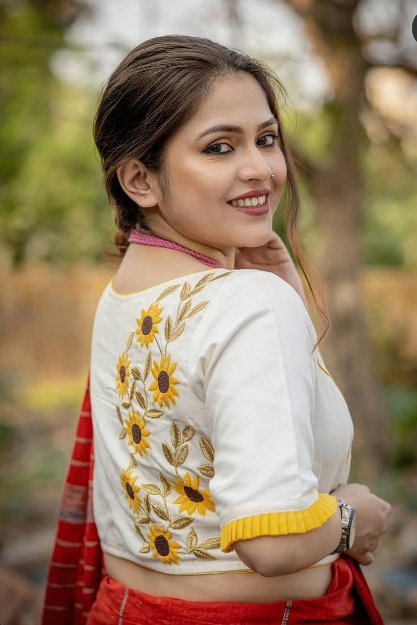 Sunflower Motif Embroidered Round Neck Pleat detailing Blouses