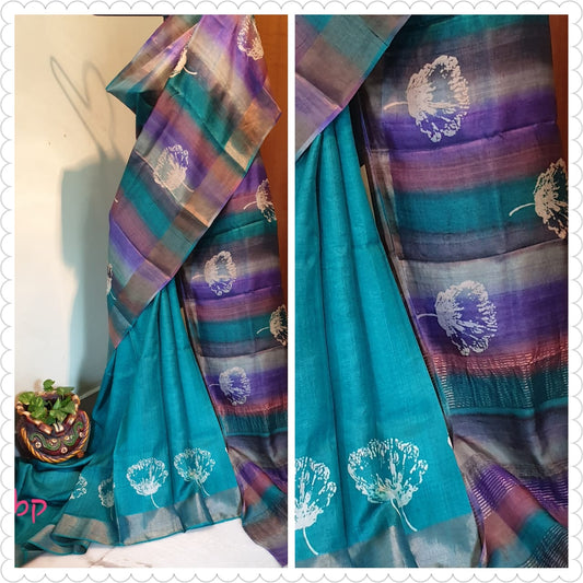 Blue Purple Block Printed Zari Border Pure Silk Mark Certified Tussar Silk Sarees