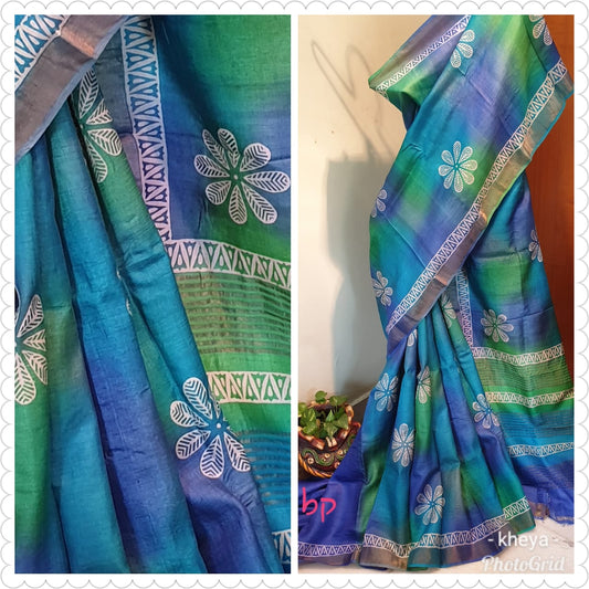 Green Blue Block Printed Zari Border Pure Silk Mark Certified Tussar Silk Sarees