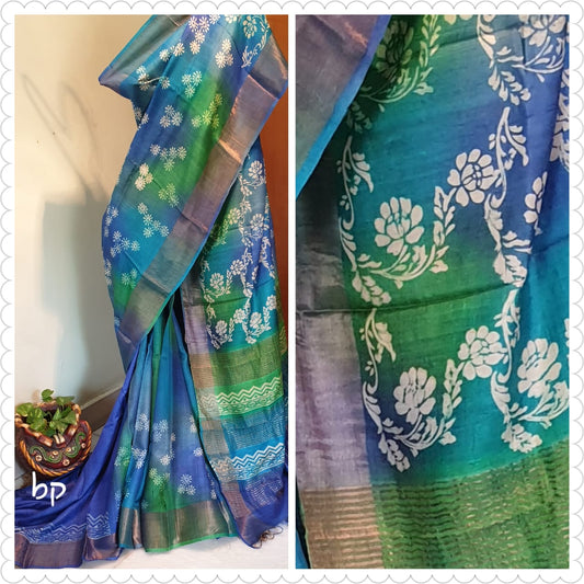 Blue Block Printed Zari Border Pure Silk Mark Certified Tussar Silk Sarees
