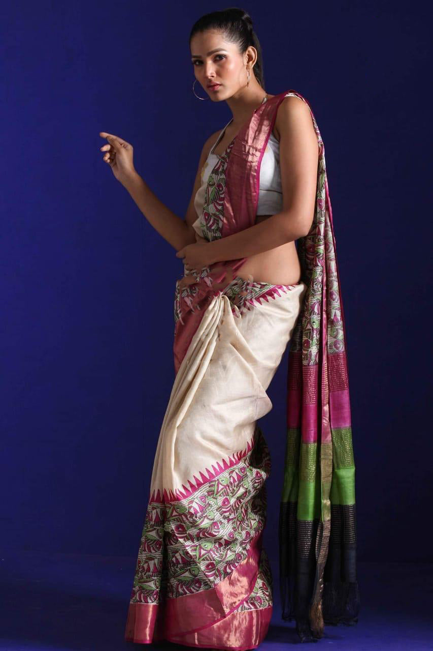 Description: Pure Handloom Zari Border Tussar Silk Saree (Silk Mark Certified)