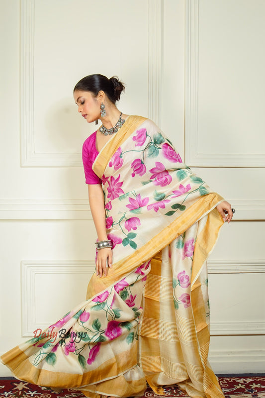 Floral Beige Pink Hand Painted Pure Silk Mark Certified Tussar Silk Sarees