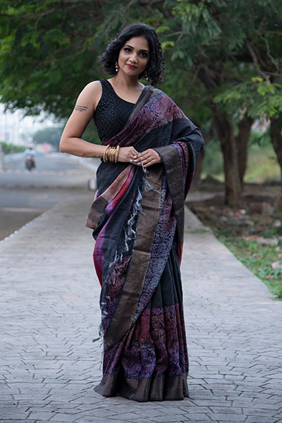 Black Block Print Zari Border Pure Silk Mark Certified Tussar Silk Sarees