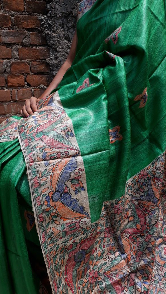 Green And MultiColour Madhubani Handpaint Pure Silk Mark Certified Tussar Ghicha Silk Sarees