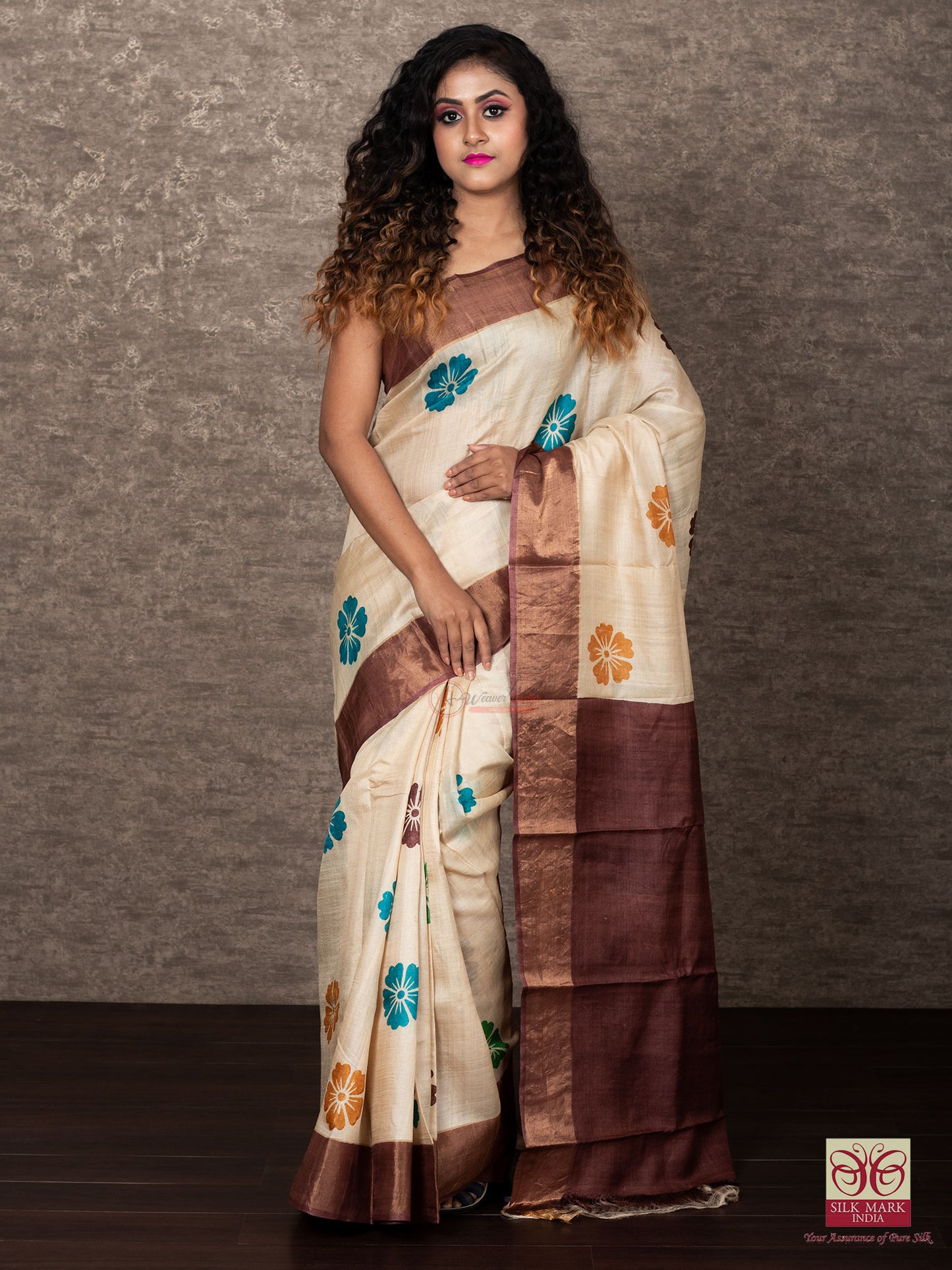 Block Printed Zari Border Pure Silk Mark Certified Tussar Silk Sarees