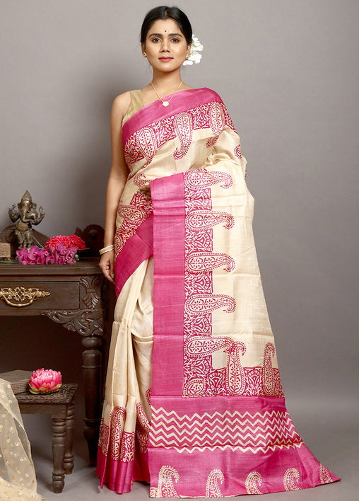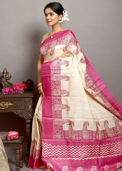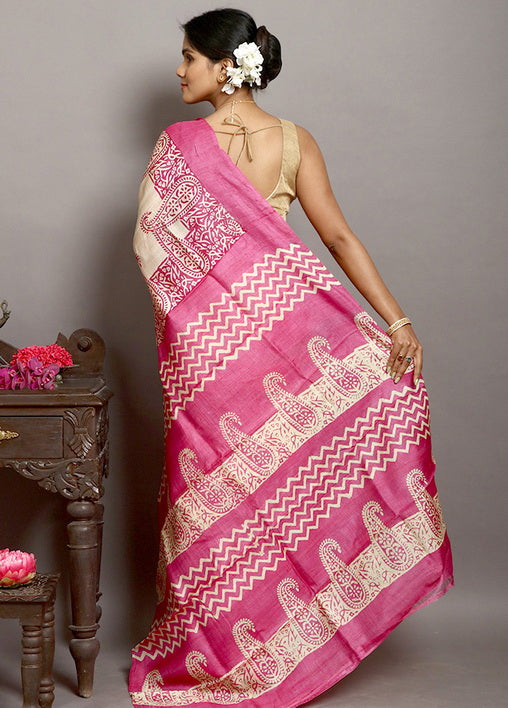 Pink Block Print Silk Mark Certified Bishnupuri Silk Sarees