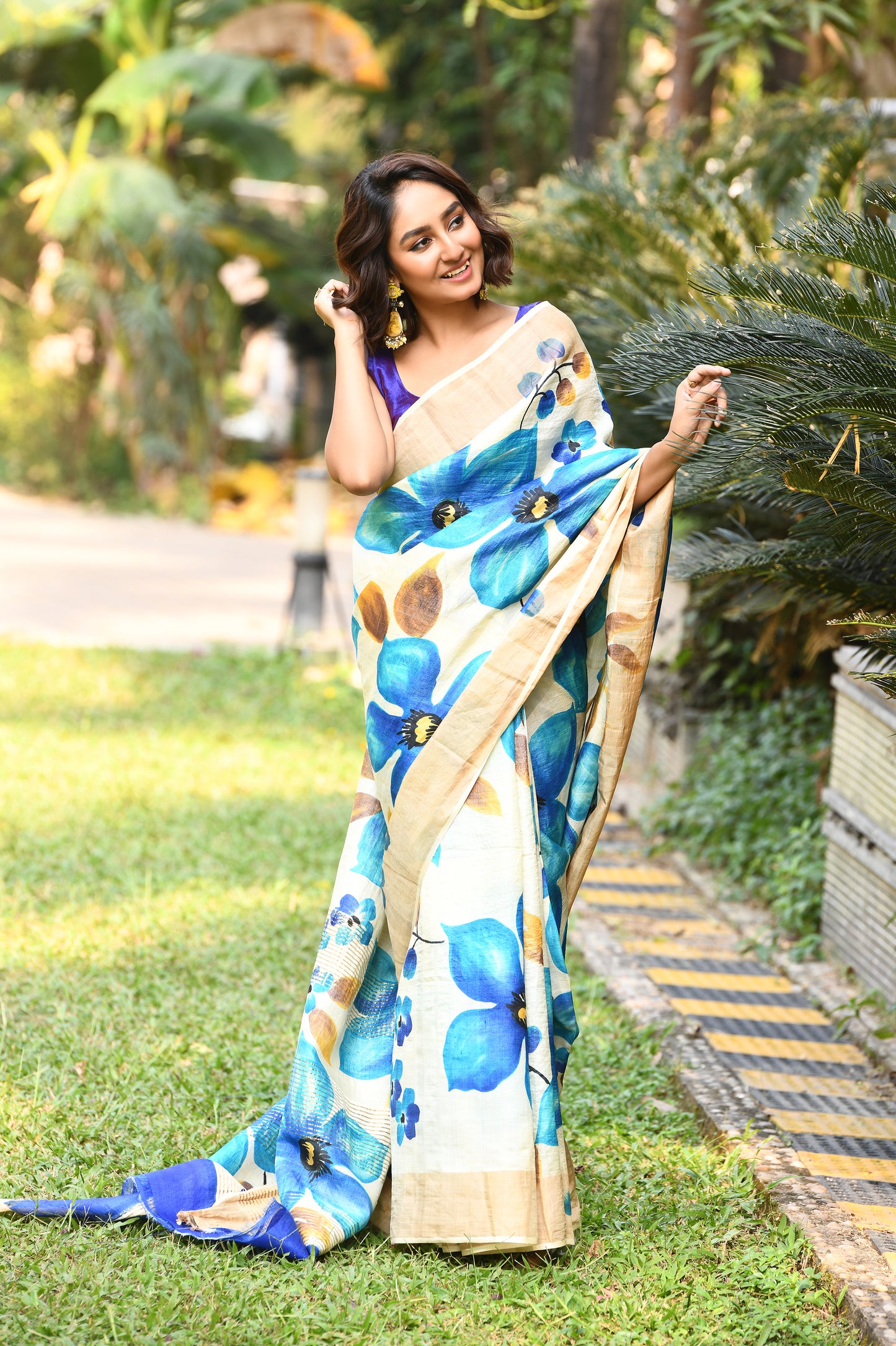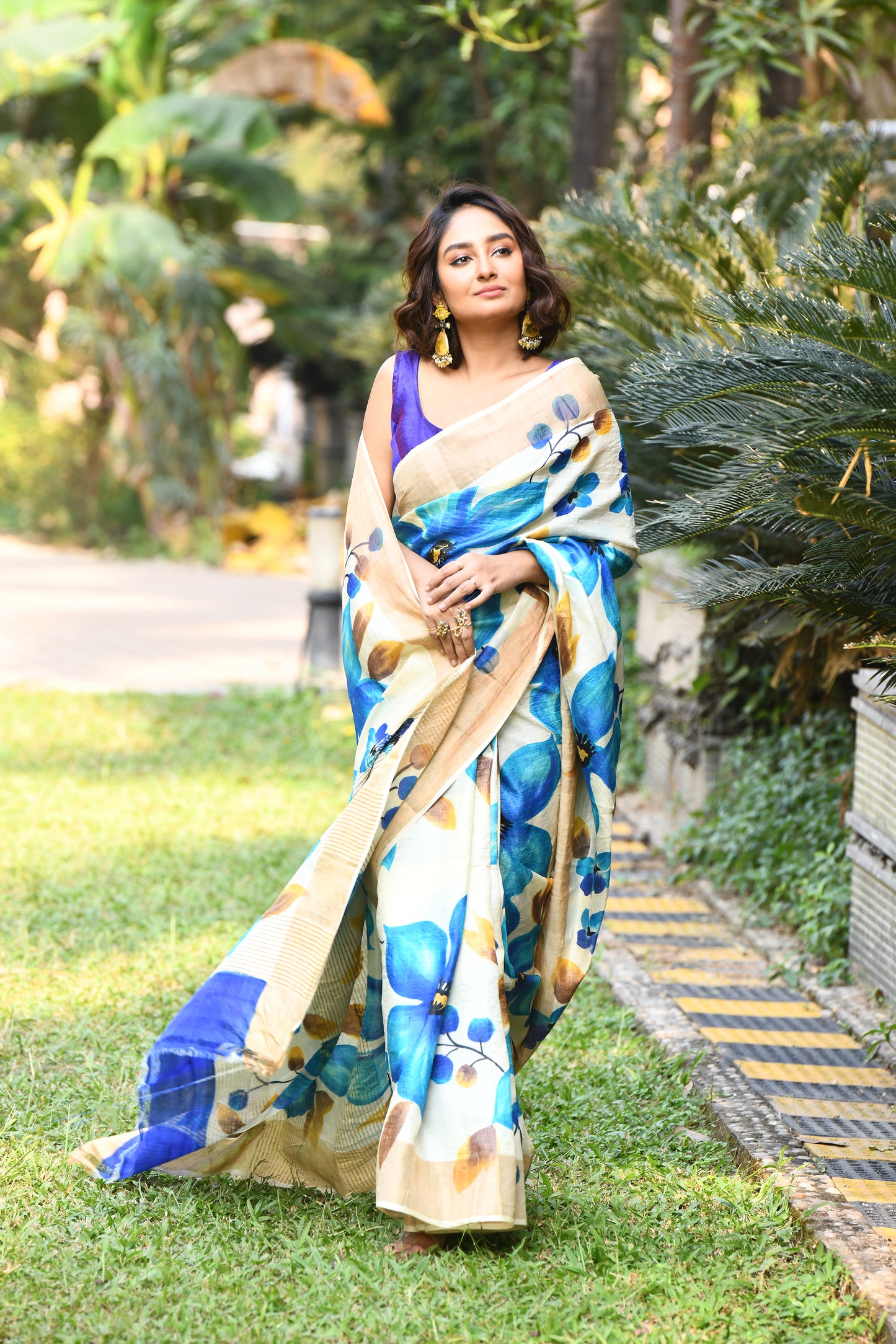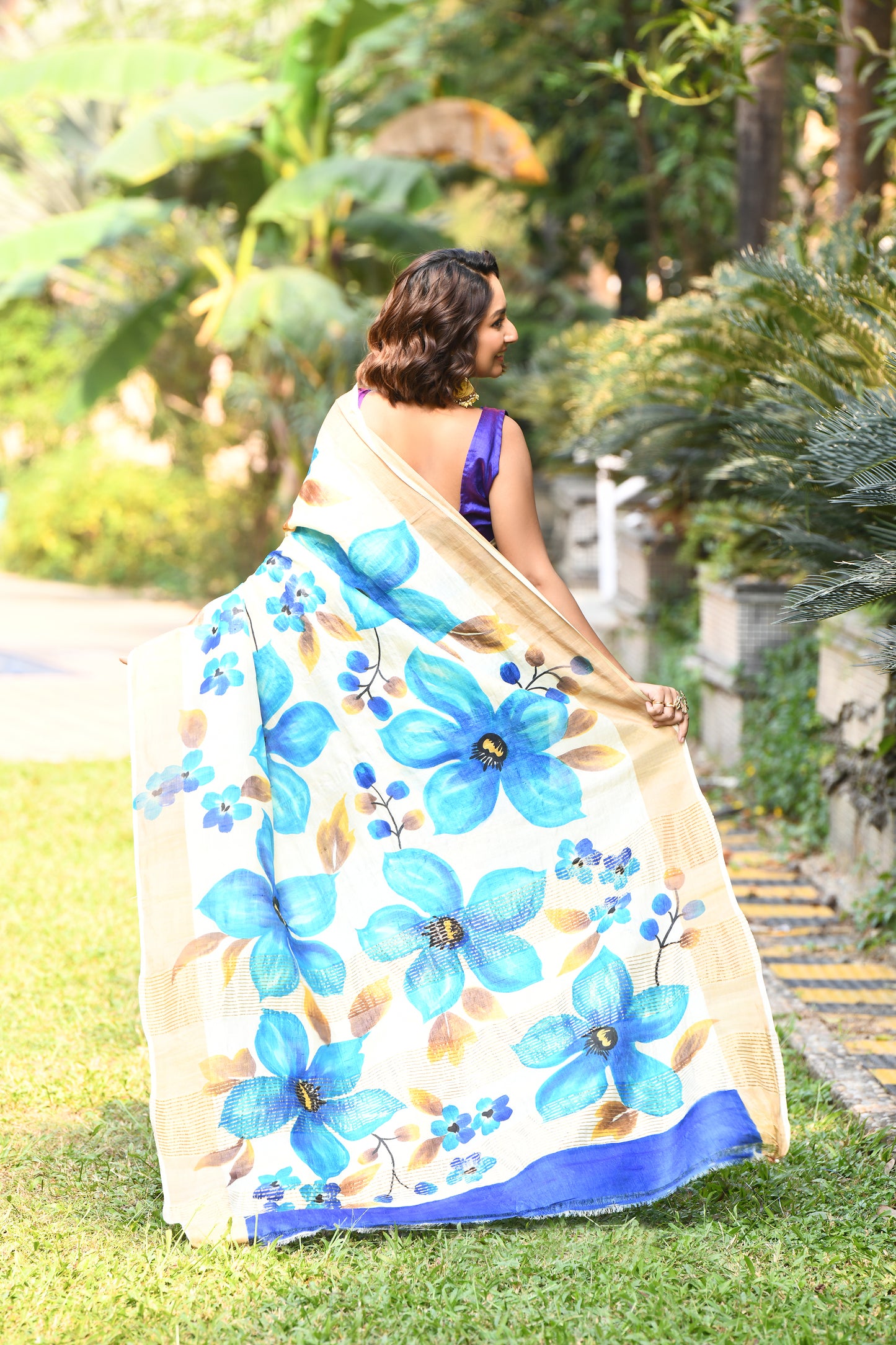 Blue Floral Hand Painted Zari Border Pure Silk Mark Certified Tussar Silk Sarees