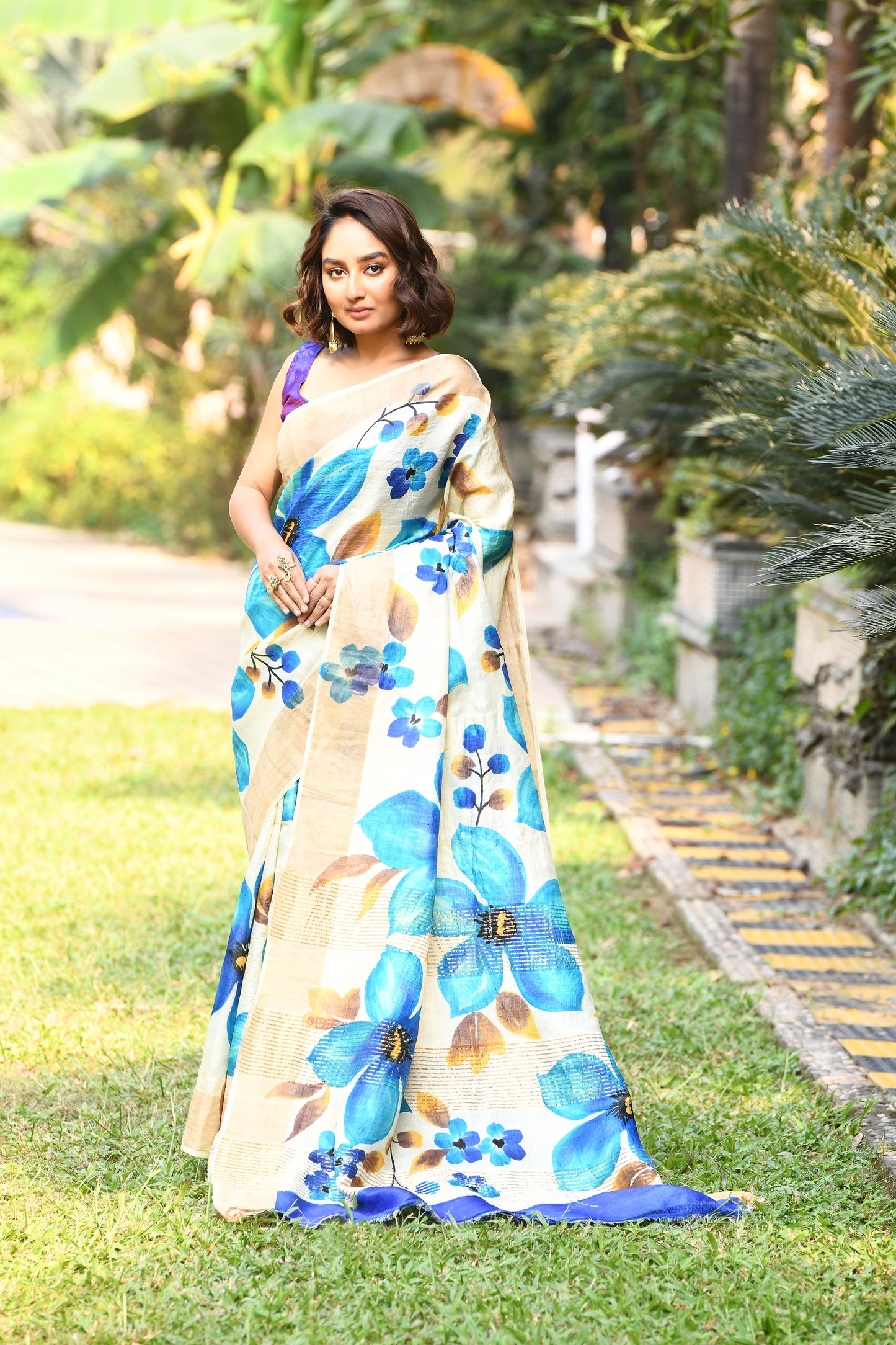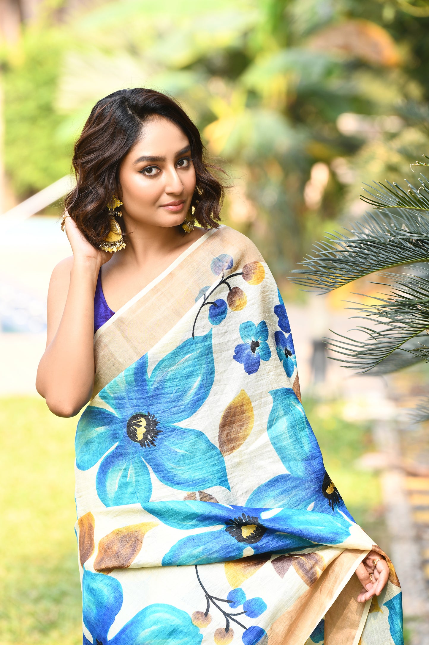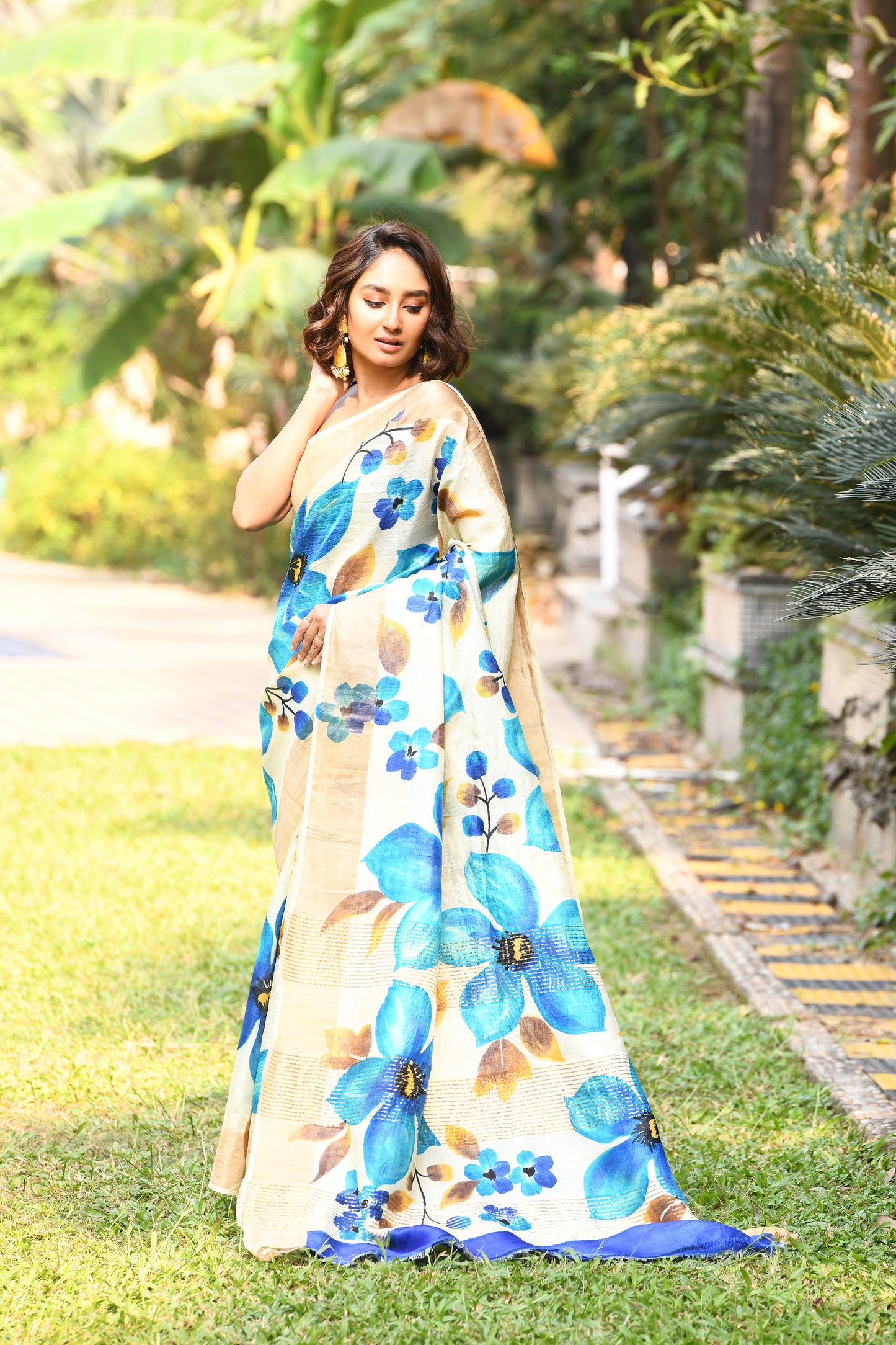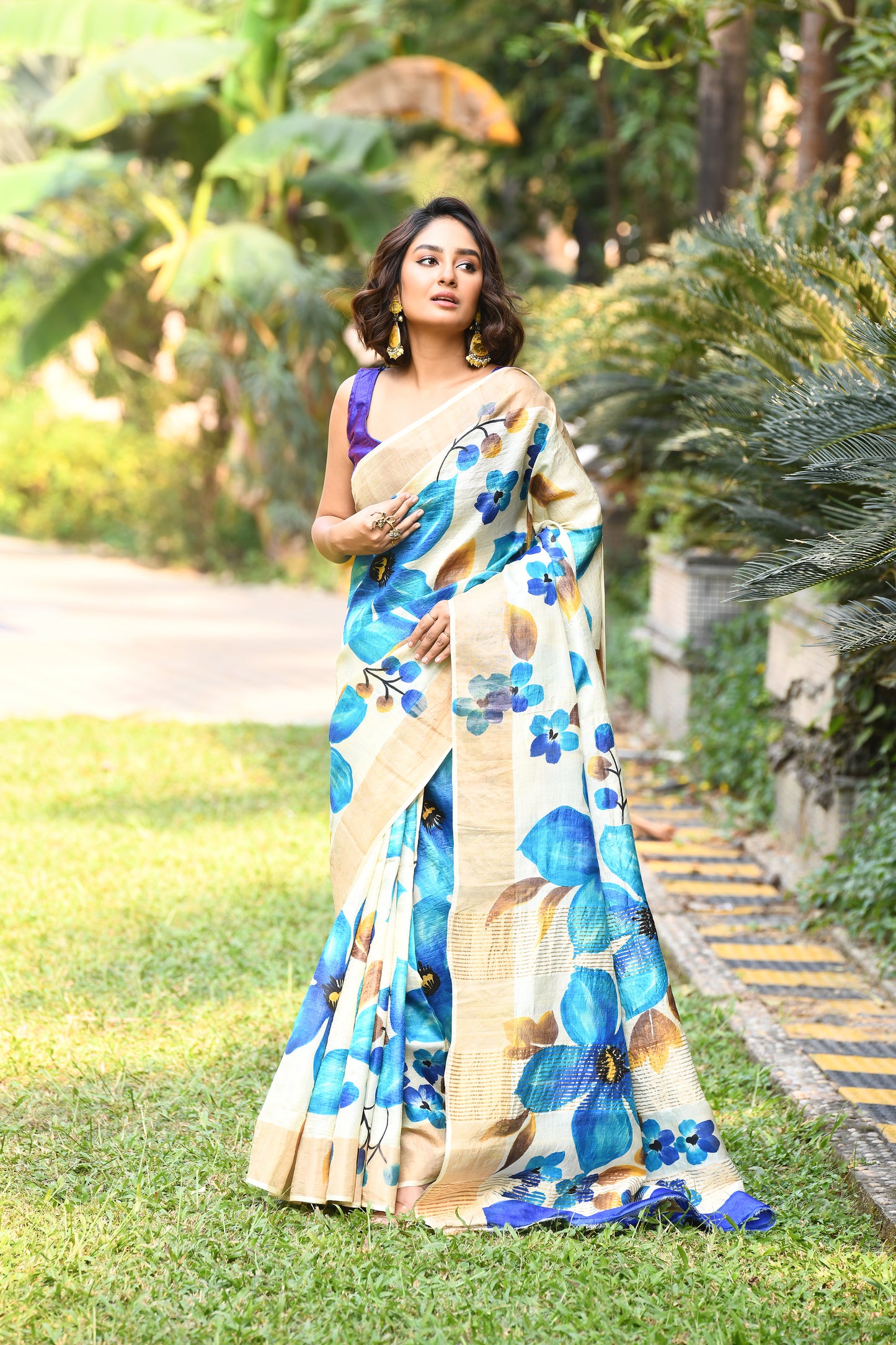Blue Floral Hand Painted Zari Border Pure Silk Mark Certified Tussar Silk Sarees