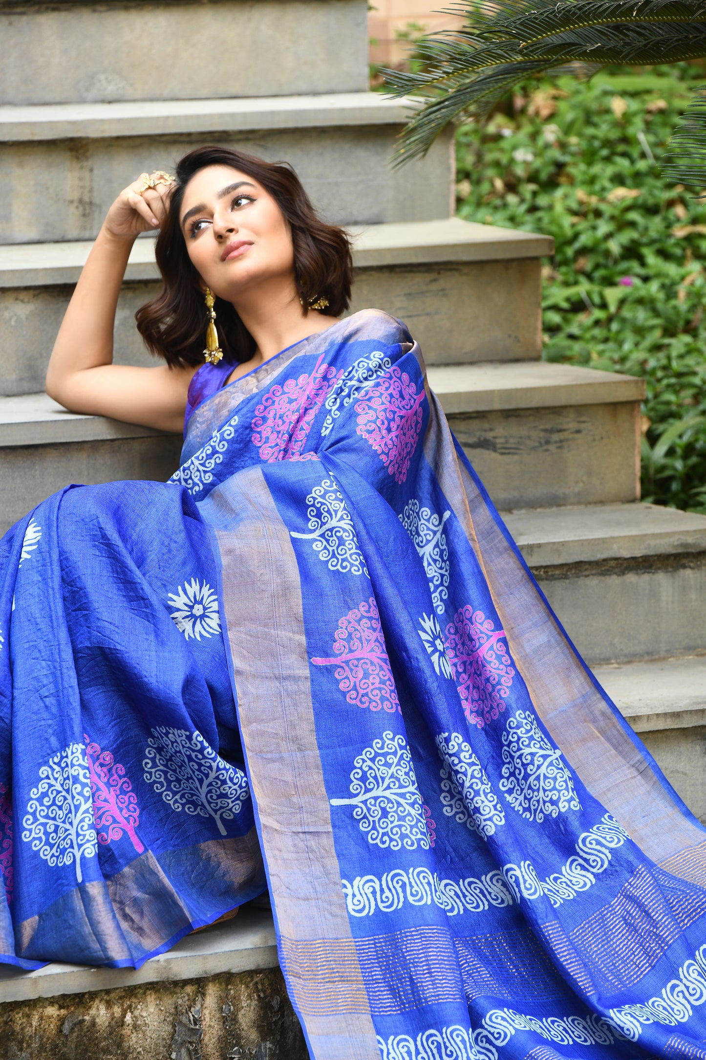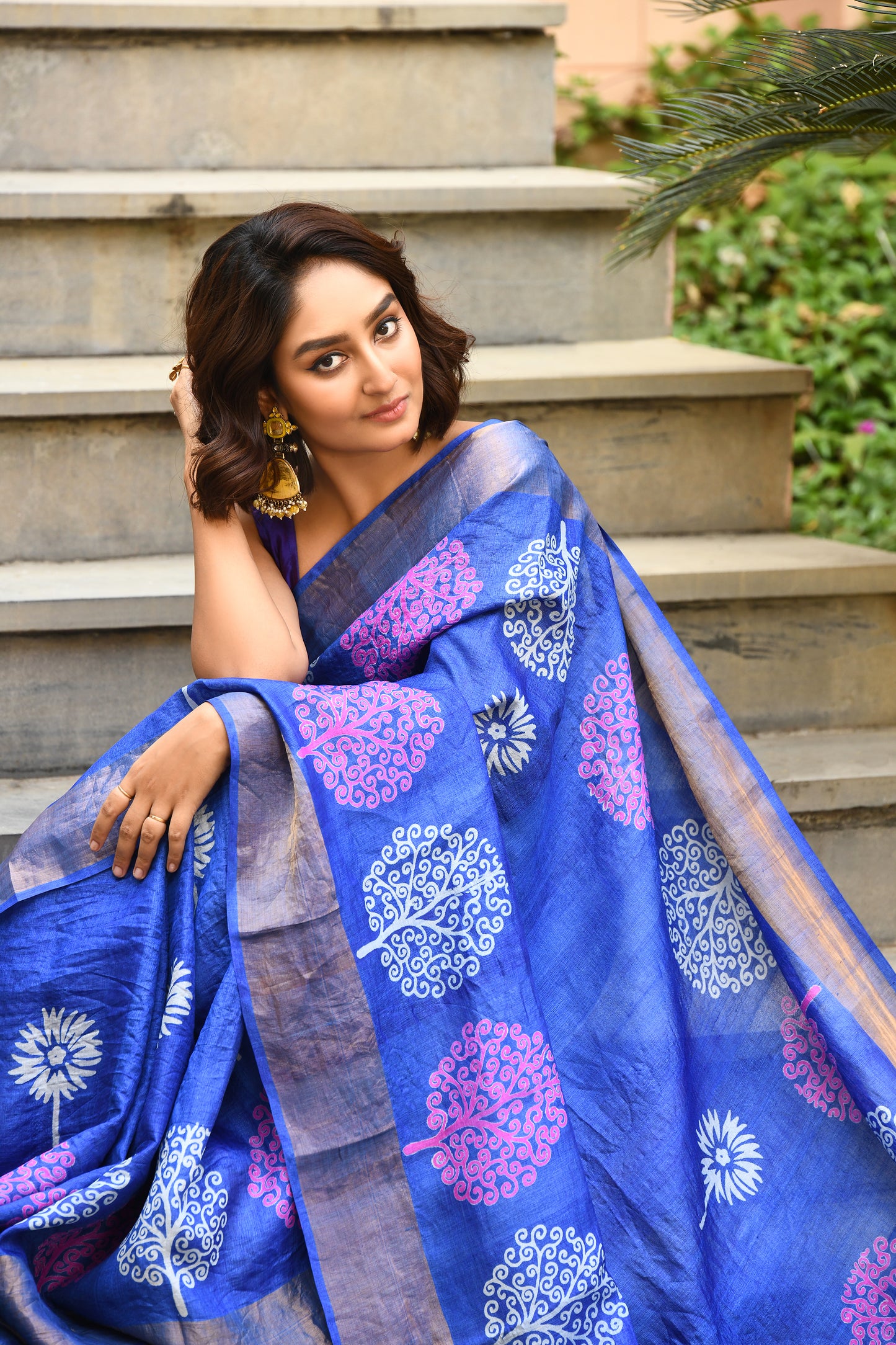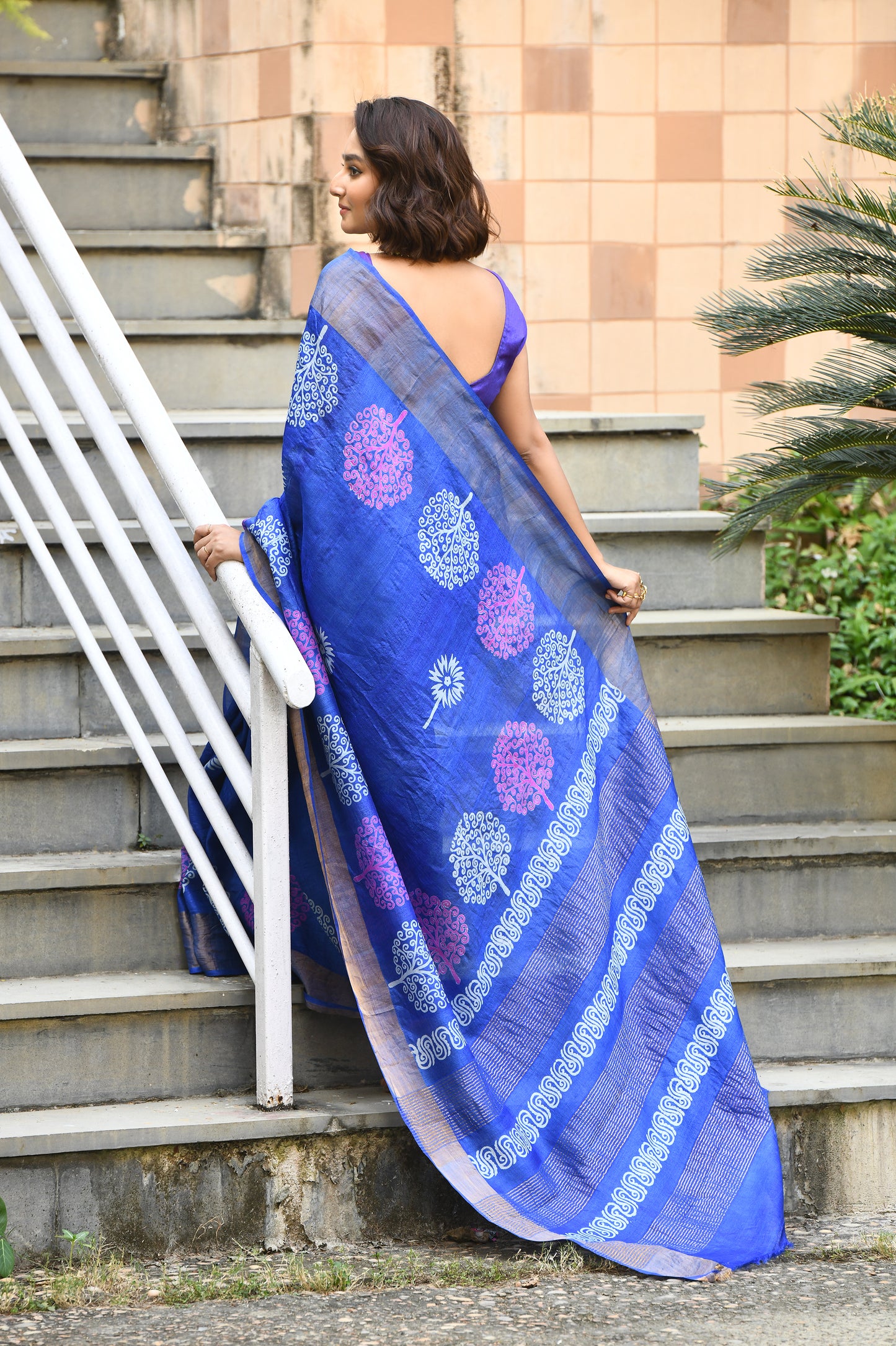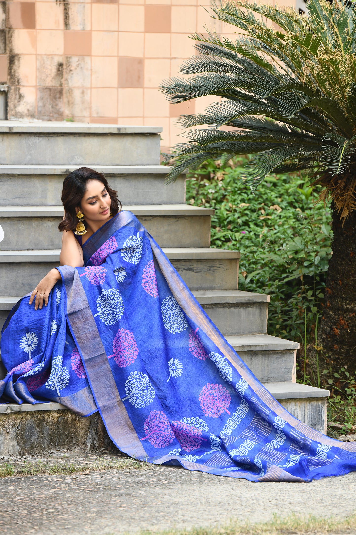Blue Floral Block Printed Zari Border Pure Tussar Sarees