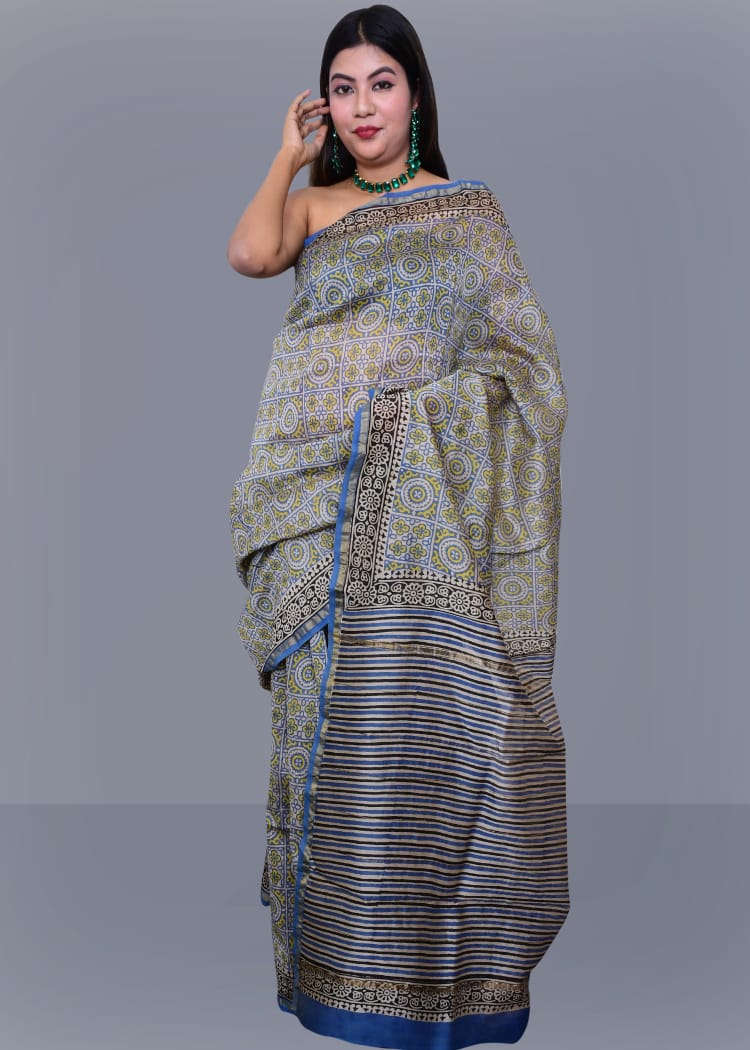 Beige Sky Blue Bagru Printed Pure Chanderi Silk Sarees