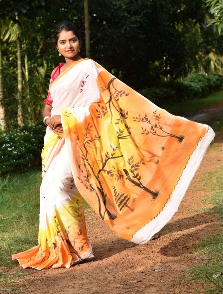 Beige Orange Hand Painted Pure Silk Mark Certified Bishnupuri Silk Sarees