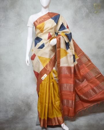 Description: Pure Handloom Zari Border Tussar Silk Saree (Silk Mark Certified)