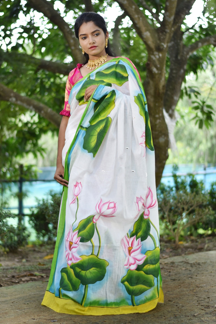 Green White Hand Painted Pure Silk Mark Certified Bishnupuri Silk Sarees