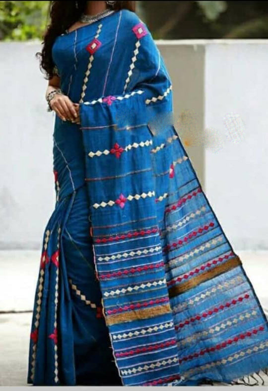 Blue Khesh Applique Work Pure Khadi Sarees