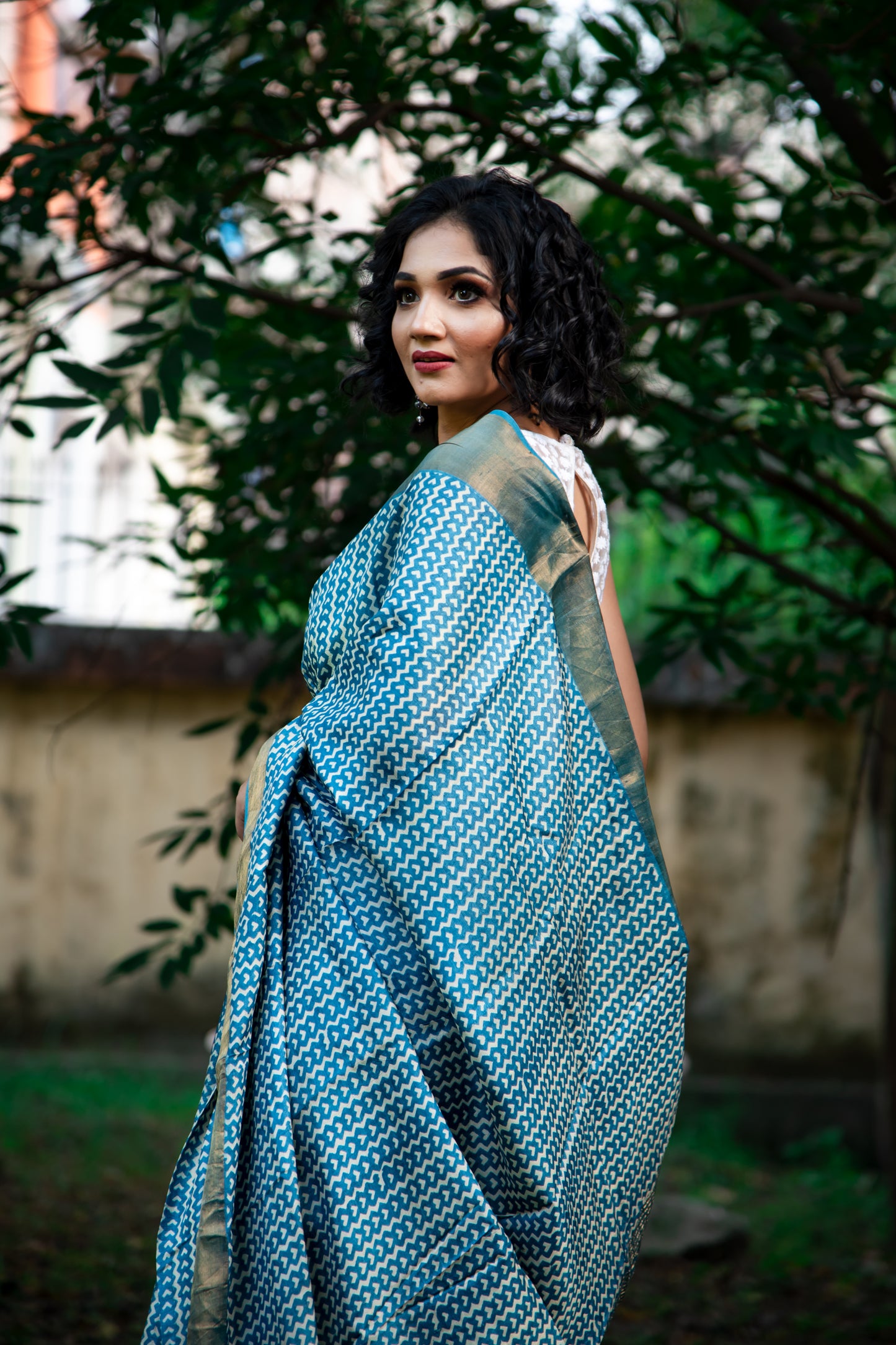 Blue Block Printed Zari Border Pure Silk Mark Certified Tussar Silk Sarees