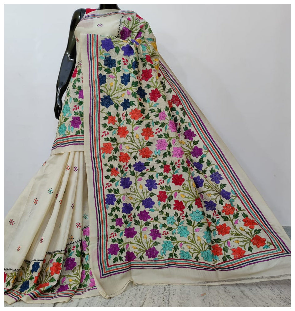 Product Description: Kantha stitch sarees are one of the famous Bengal hand crafted saree. So many artistic skill is seen in the pure silk and tussar silk saree. All design are seen in the saree are fully handwoven which takes 2 week to two month to make the saree. In some saree you can find hand painting and then kantha stitch on it. This Dailybuyys Kantha stitch tussar silk saree is really excellent and beautiful.
