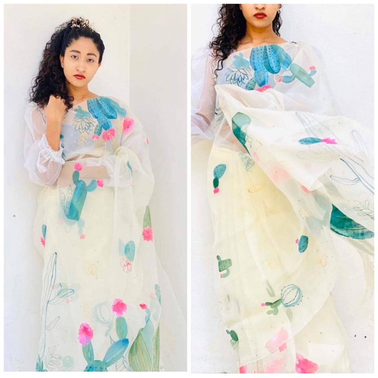 White Pure Digital Print Organza Sarees