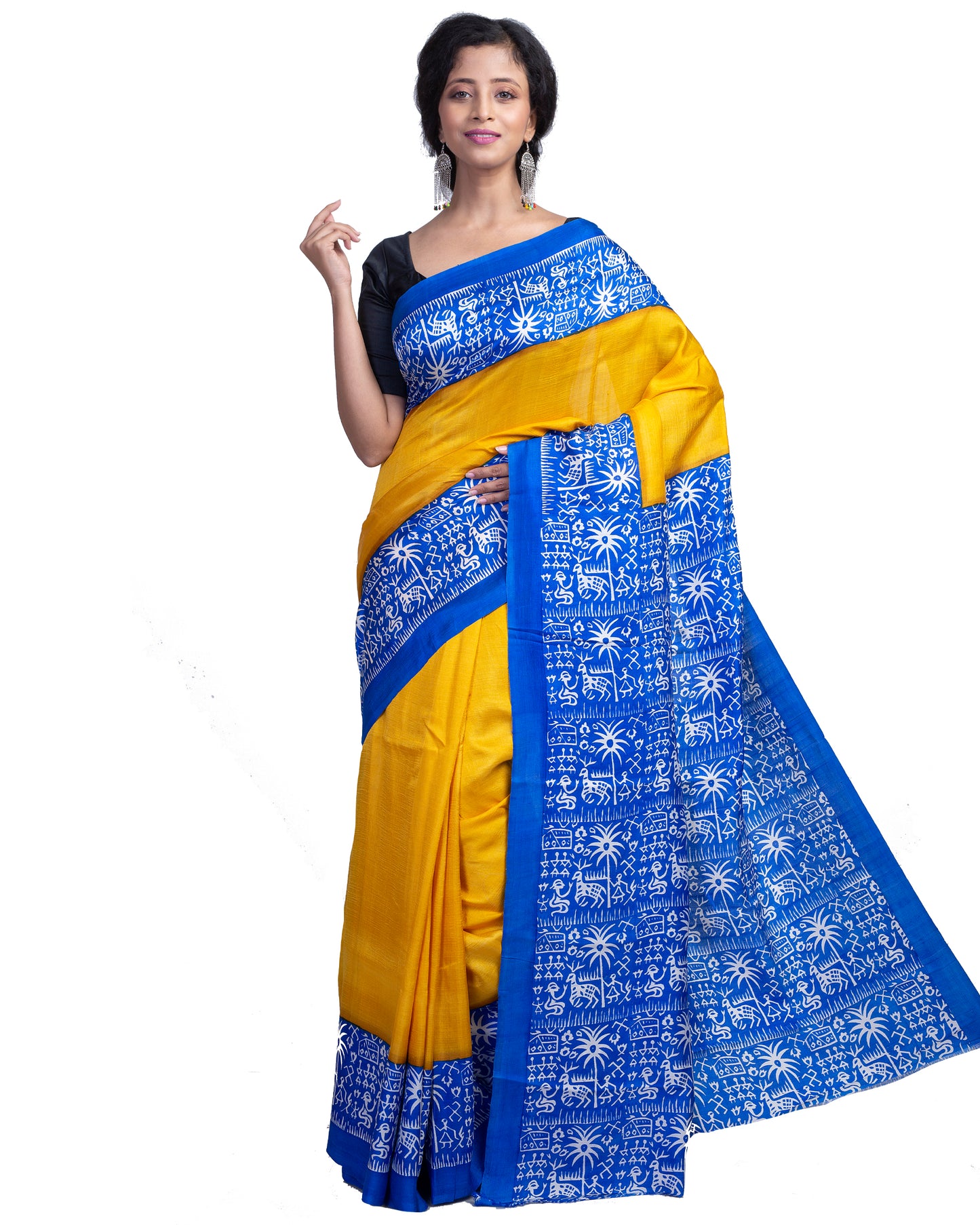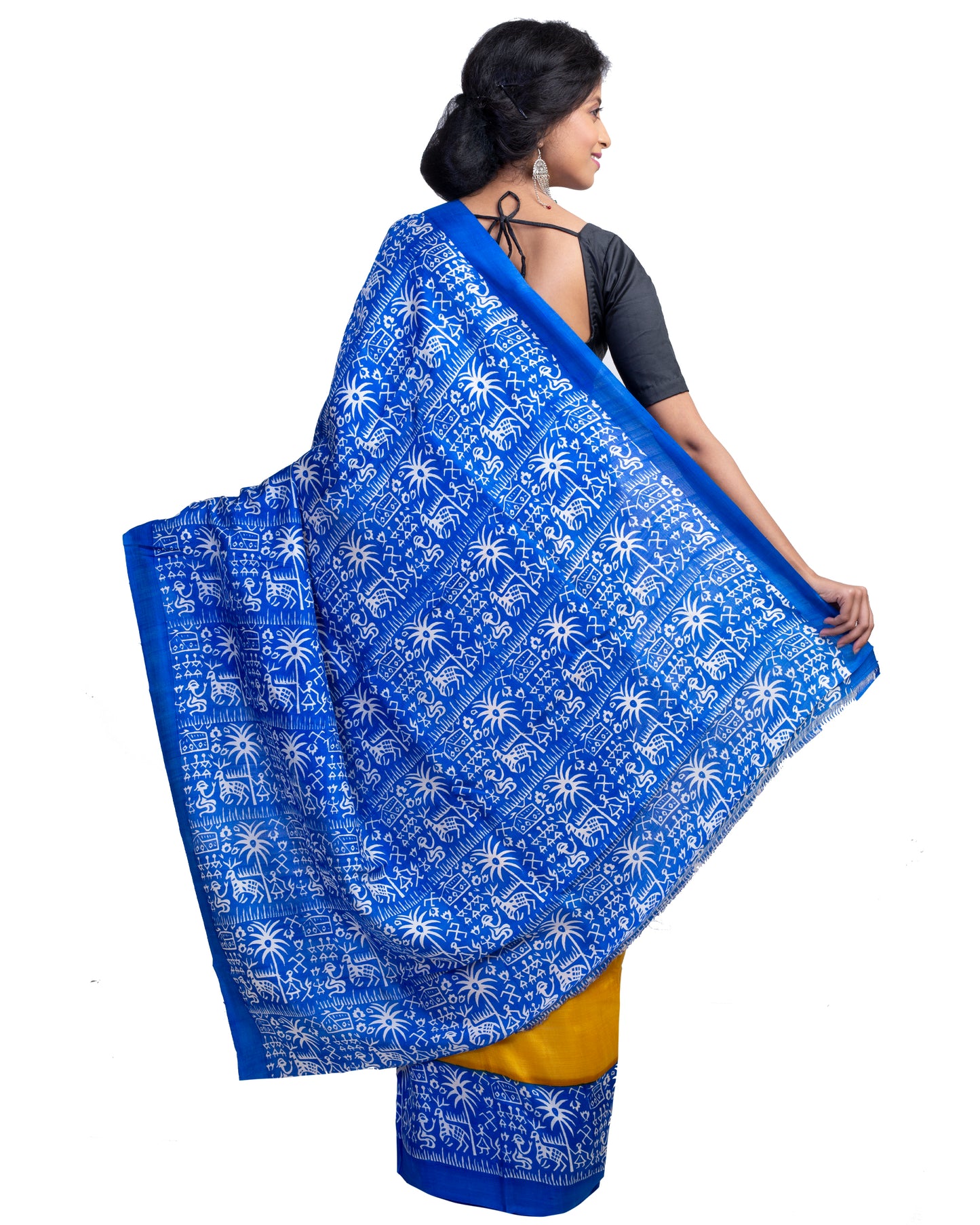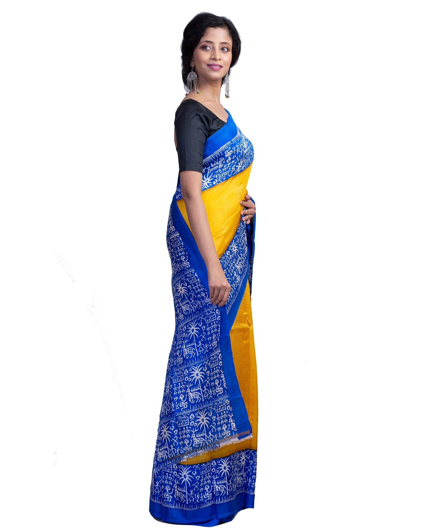 Yellow Blue Pure KK Block Printed Silk Mark Certified Bishnupuri Silk Sarees