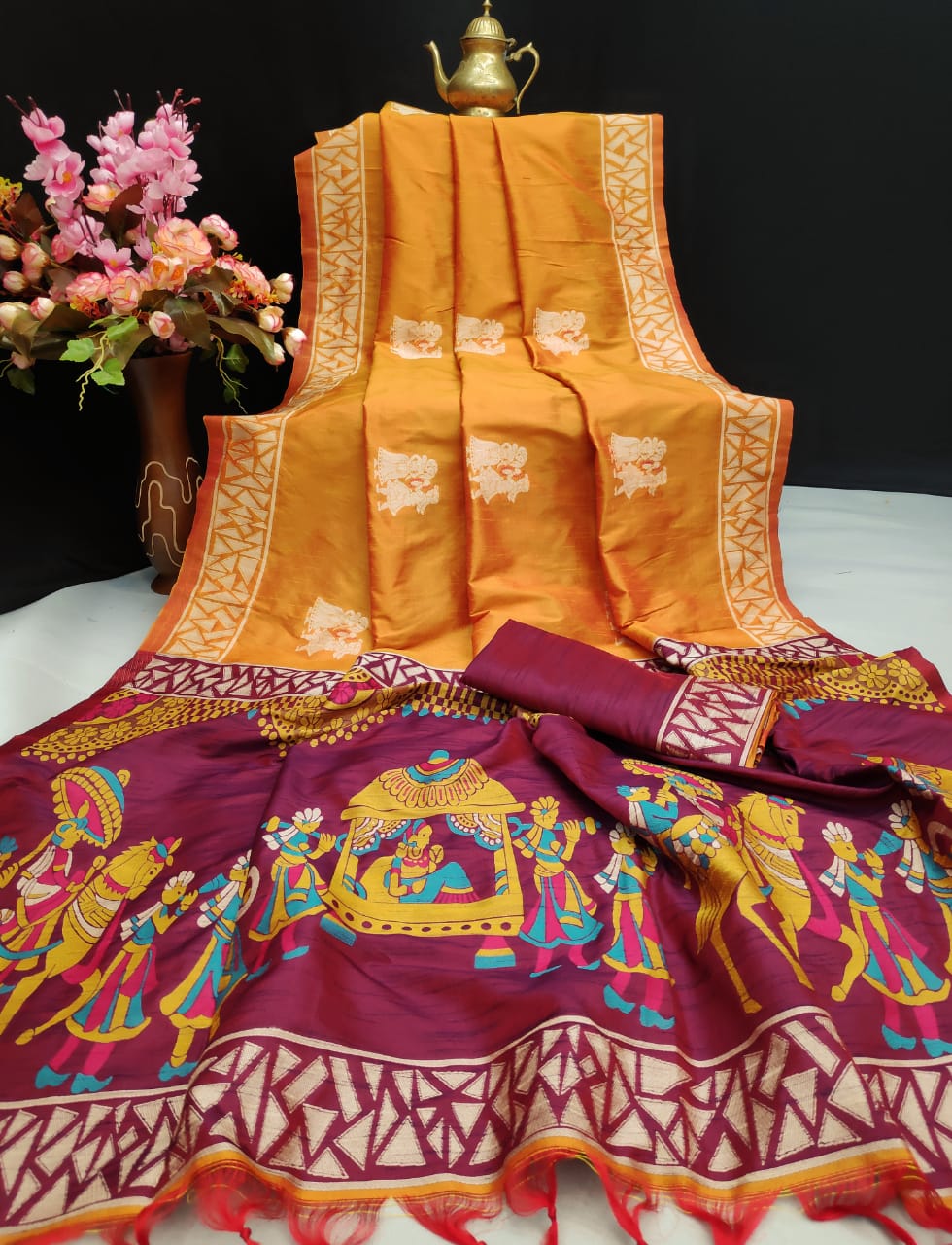 Fire Yellow & Mulberry Shades Handwoven Pure Raw Silk Sarees
