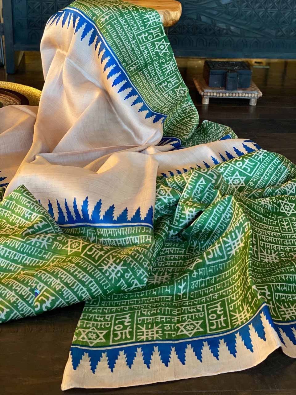 Description: Green And White Block Printed Pure Tussar Silk Sarees (Silk Mark Certified)