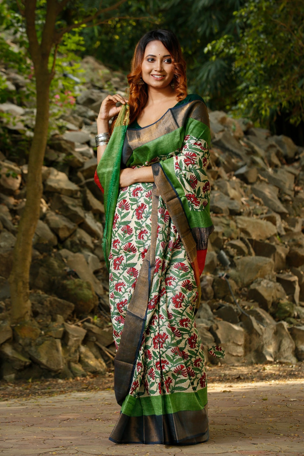 Green Floral Beautiful Block Printed Zari Border Pure Silk Mark Certified Tussar Silk Sarees