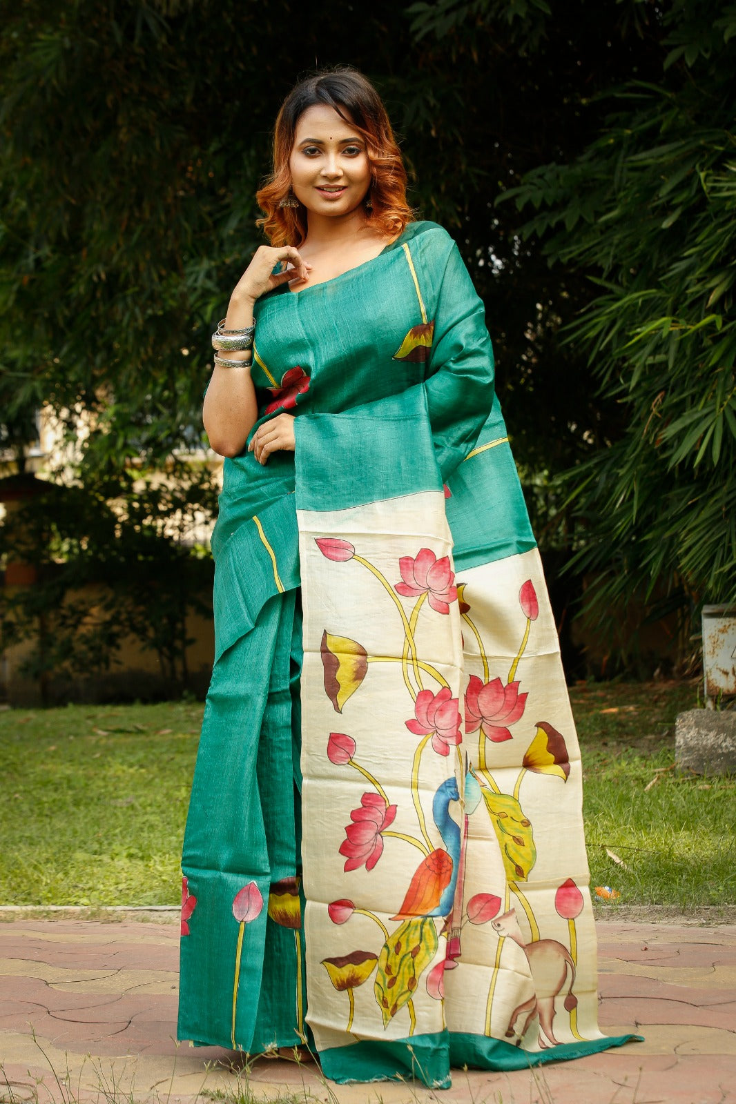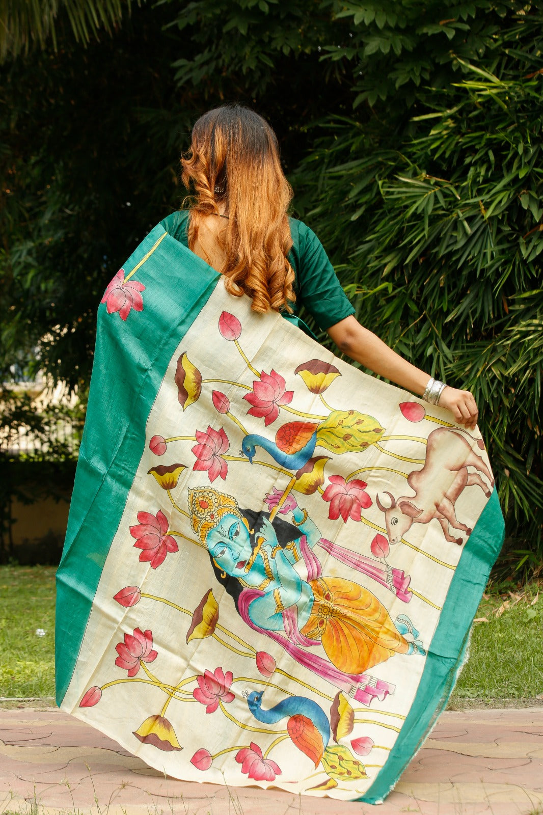 Lord Krishna Hand Painted Plain Pure Silk Mark Certified Tussar Silk Sarees