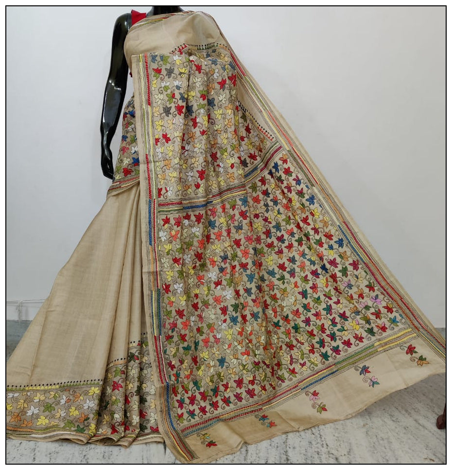 MultiColur Floral Hand Embroidery Kantha Stitch Sarees on Pure Gachi Pure Silk Mark Certified Tussar
