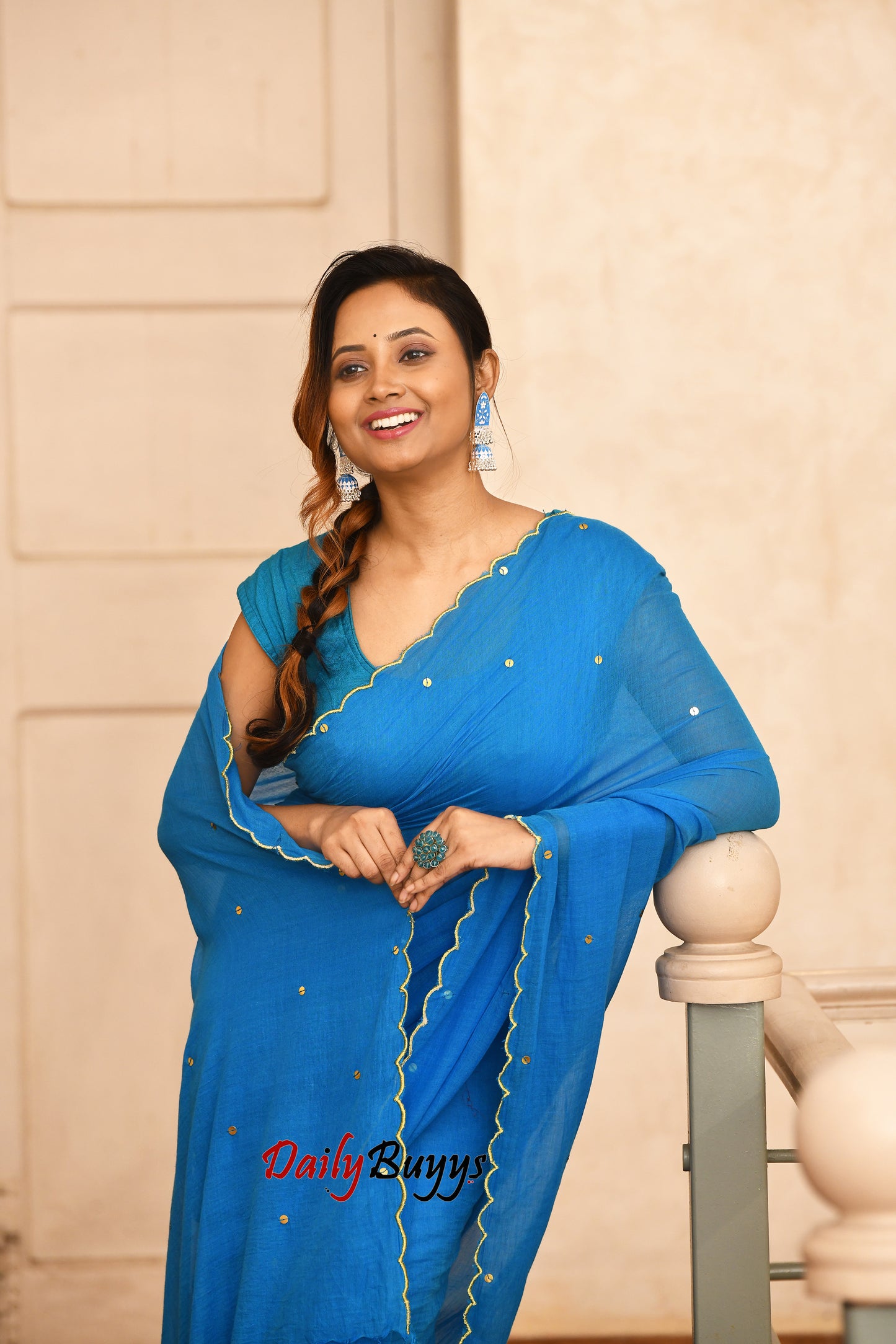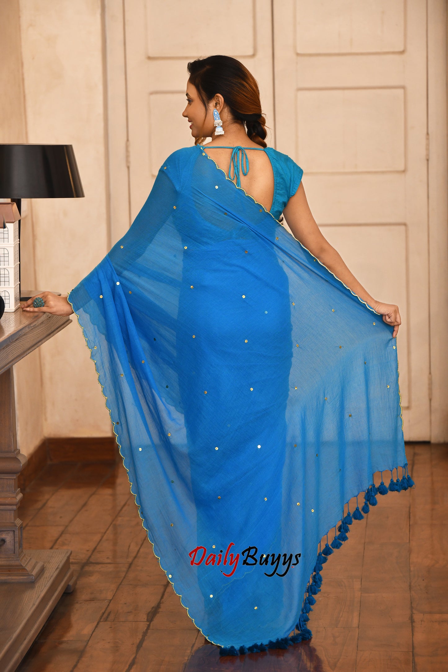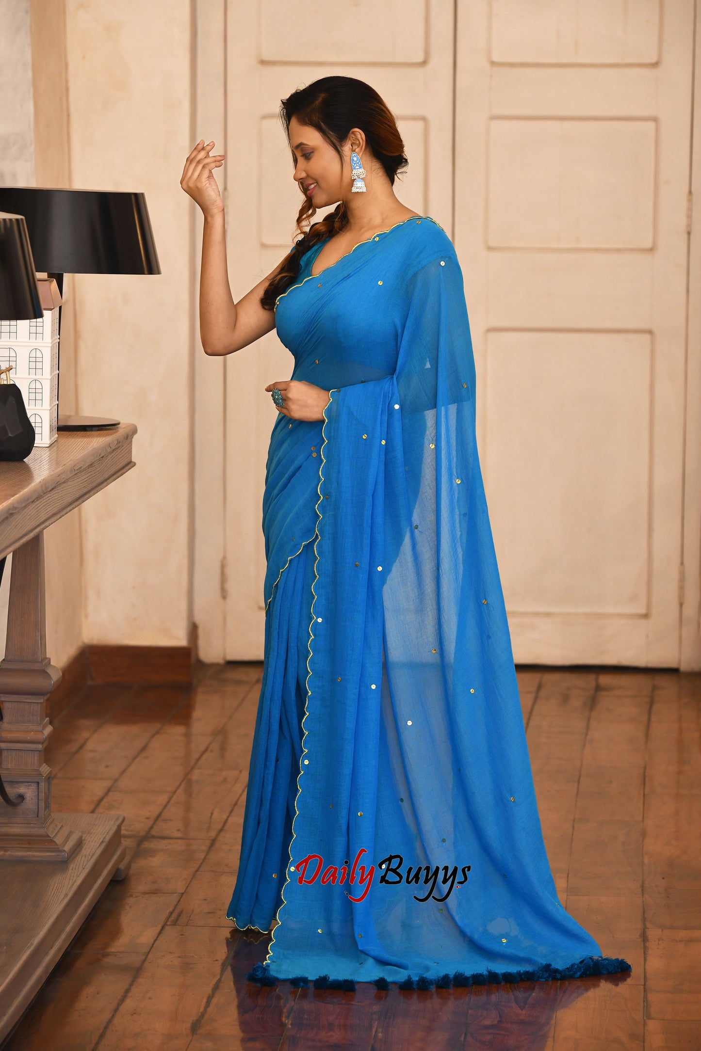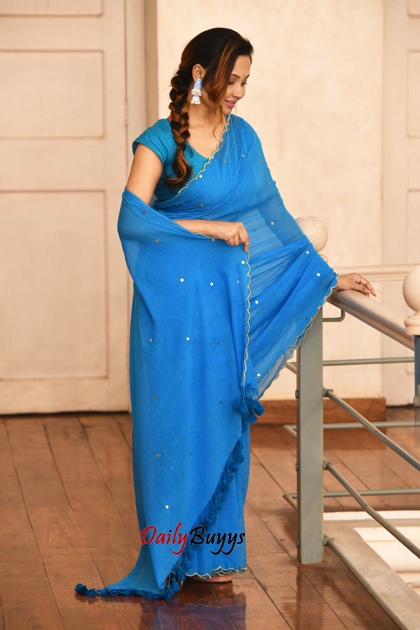 Neon Blue Soft Mulmul Cotton Handloom Sarees