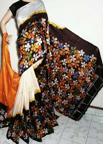 Beige Black Hand Painted Pure Silk Mark Certified Bishnupuri Silk Sarees