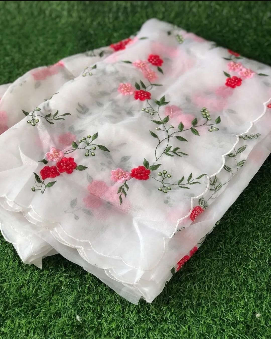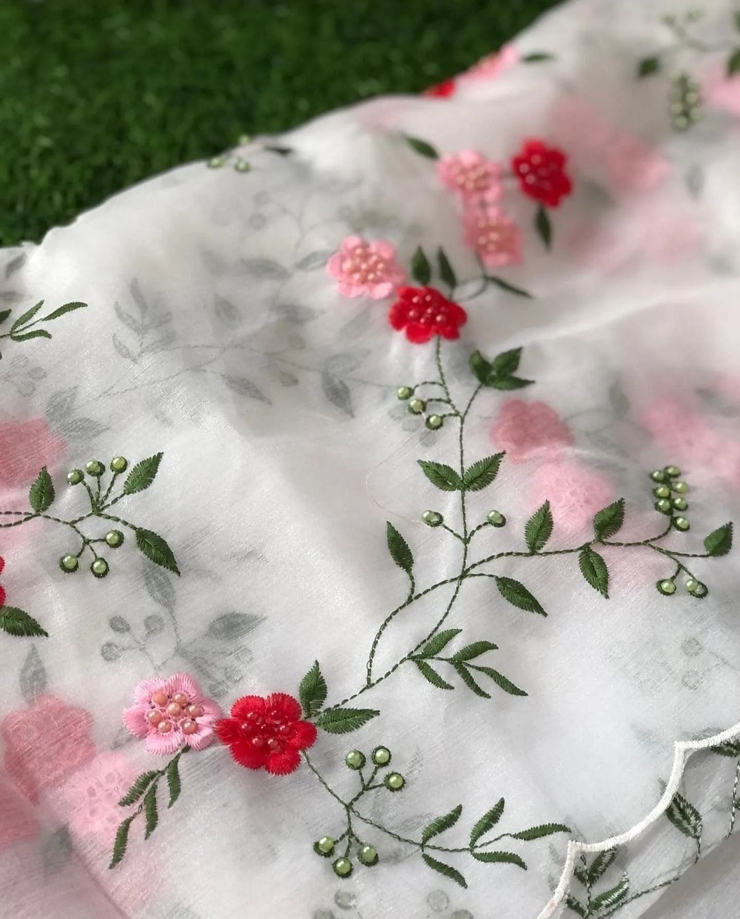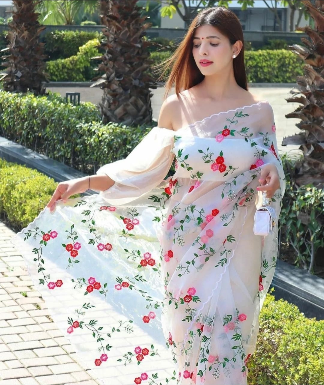 White Organza Saree with pink and red  floral embroidery.