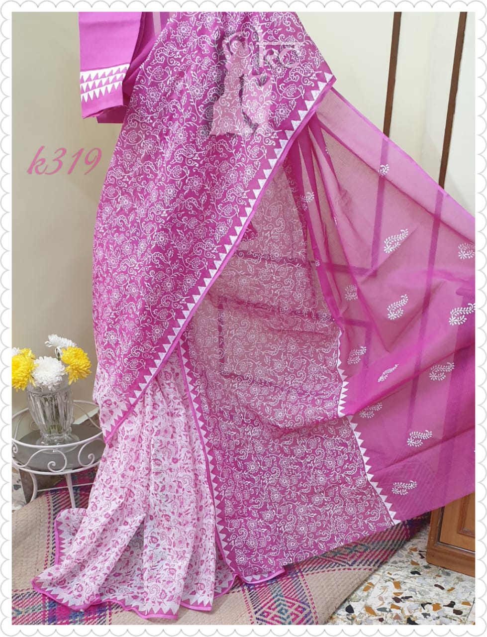 Purple And White Block Printed Pure Pure Cotton KK Kota Doriya Sarees