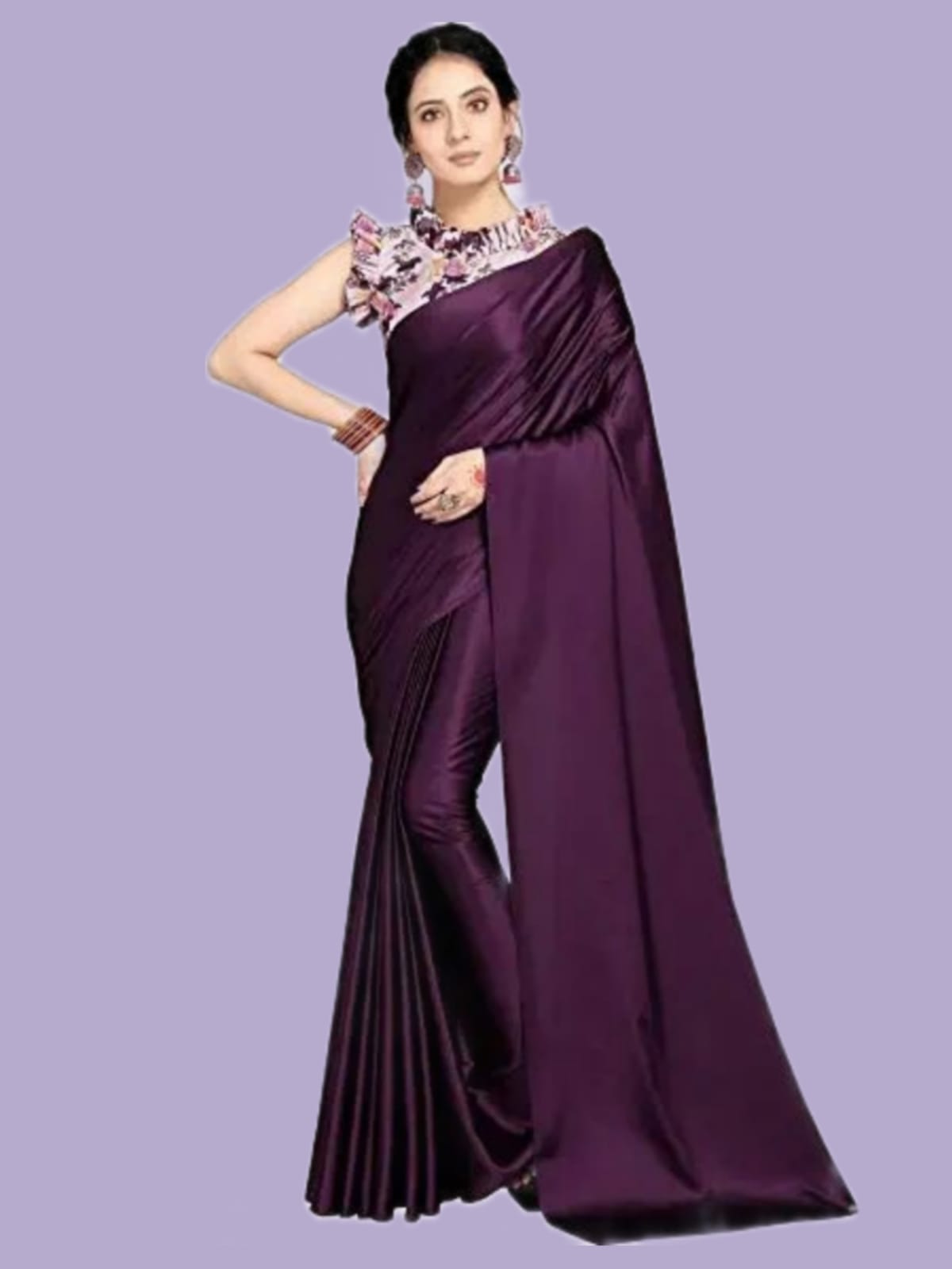 Dailybuyys bring to you royal satin sarees. Delve into the rich midnight purple lux fabric to add to your boldness. Steal the spotlight at any event and make heads turn with Dailybuyys satin designer saree collection. Our satin sarees will hug you in the most flattering way and enhance your silhouette. Pair the saree with a sequin blouse or a solid silk blouse. The finest and most comfortable satin sarees are carefully curated by Dailybuyys to provide customer satisfaction.