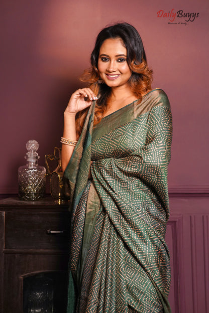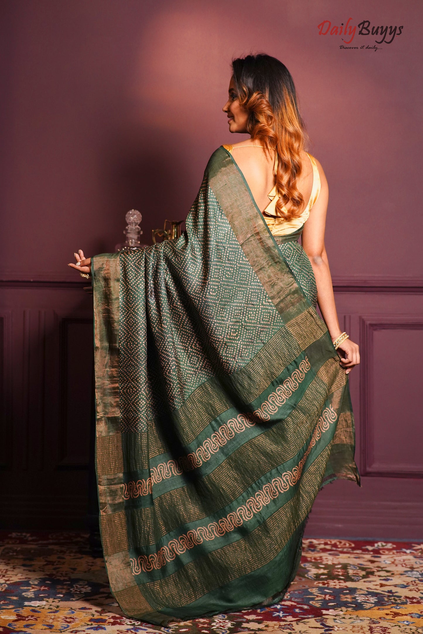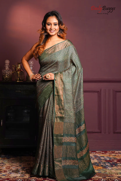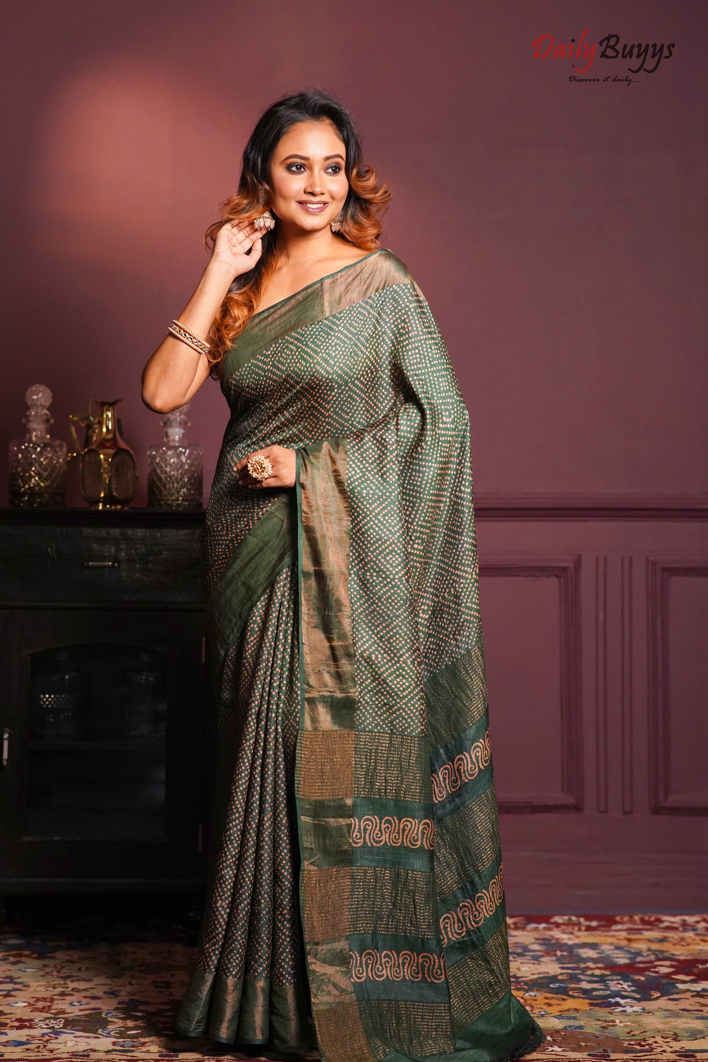 Rajasthani Chundari Dot Block Printed Zari Border Pure Silk Mark Certified Tussar Silk Sarees