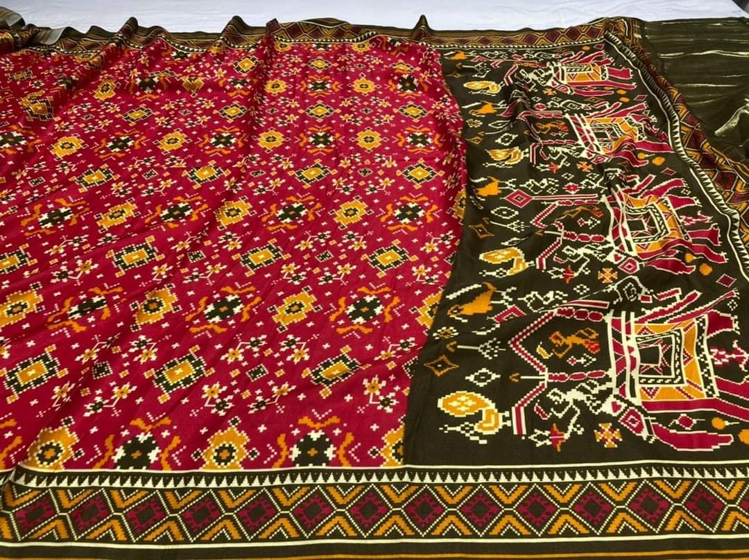 Red And Juniper Green Ajrakh Pure Gazzi Silk Mark Certified Bishnupuri Silk Sarees