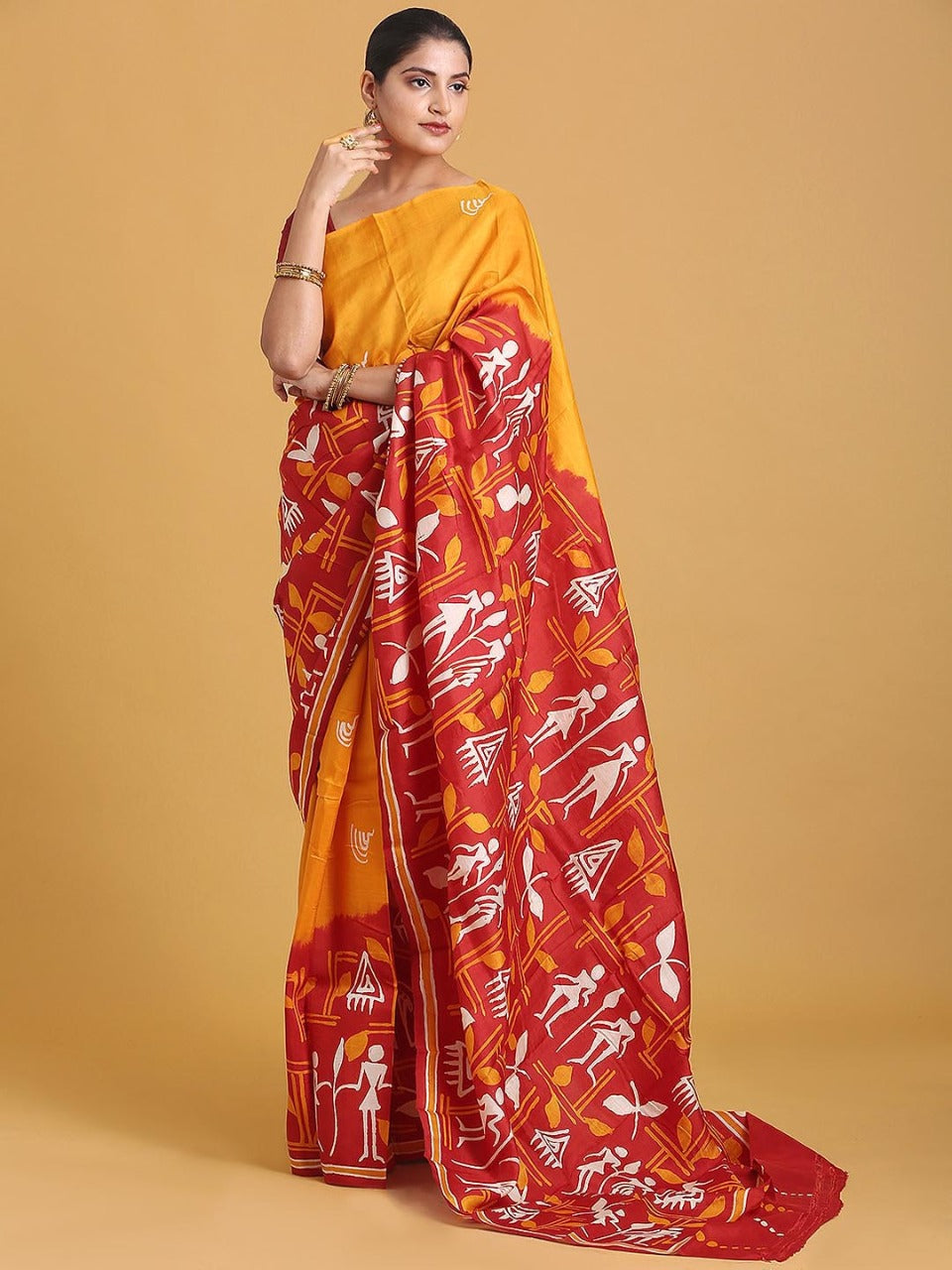Red And Yellow Tribal Hand Painted Pure Silk Mark Certified Bishnupuri Silk Sarees