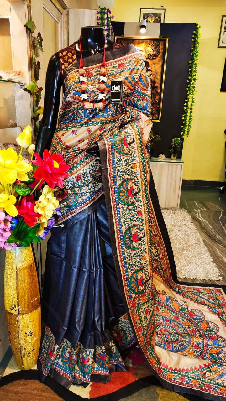 Royal Blue Madhubani Printed Pure Silk Mark Certified Tussar Ghicha Silk Sarees