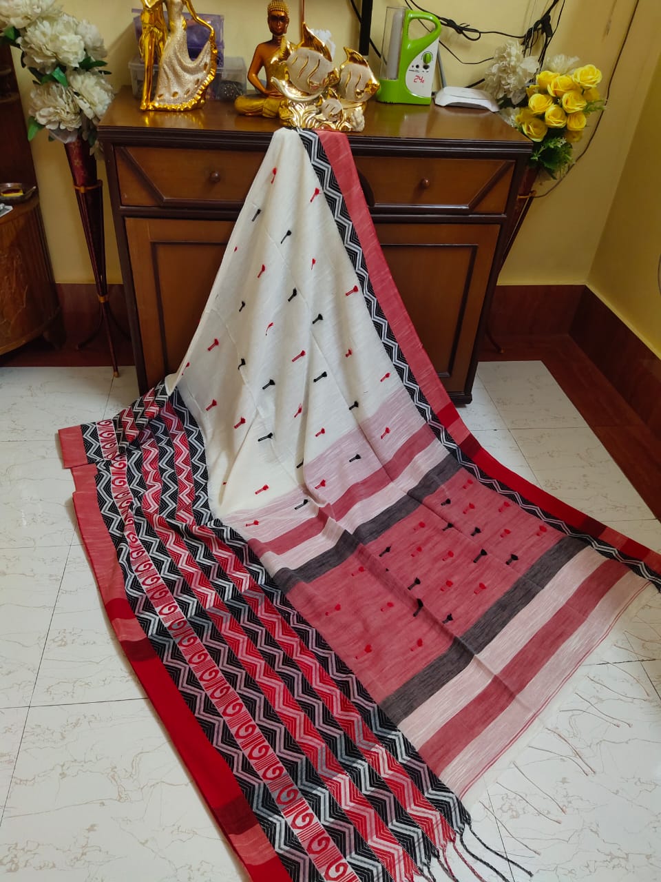 White And Red Khadi Pure Cotton Handloom Begompuri Mosal Sarees